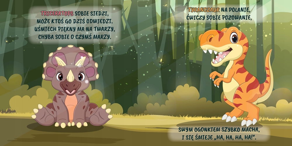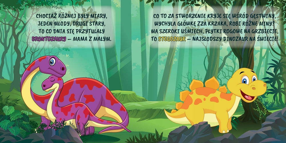 Witajcie w krainie prehistorycznych zwierząt. W tej kolorowej książeczce czekają na Was sympatyczne dinozaury, zarówno te małe, jak i duże. Spotkacie tu m.in. wesołego triceratopsa i jego mamę, młodego tyranozaura i jego tatę czy uczącego się latać pterodaktyla. Dzięki krótkim wierszykom poznacie charakterystyczne cechy tych stworzeń i będziecie się świetnie bawić.