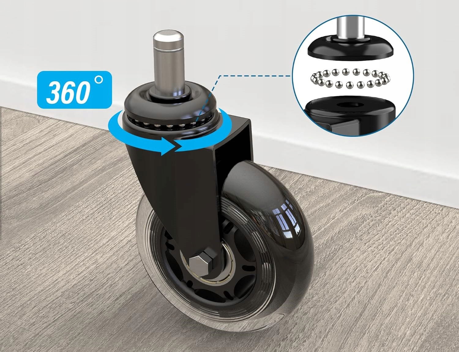 Wymień swoje stare, hałaśliwe kółka w krześle biurowym na zestaw 5 cichych, gumowych kółek WEWILL! Zaprojektowane, by nie rysować ani nie brudzić podłóg, te 3-calowe kółka zapewnią płynne i bezpieczne przesuwanie po drewnie, parkiecie, laminacie, winylu, płytkach i dywanach. Wykonane z przemysłowej stali, łożysk kulkowych i trwałego poliuretanu, są niezwykle wytrzymałe – każde kółko może utrzymać do 60 kg, a cały zestaw do 300 kg! Montaż zajmuje zaledwie 30 sekund i nie wymaga żadnych narzędzi.