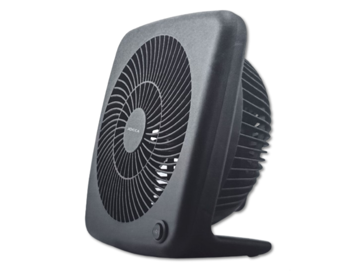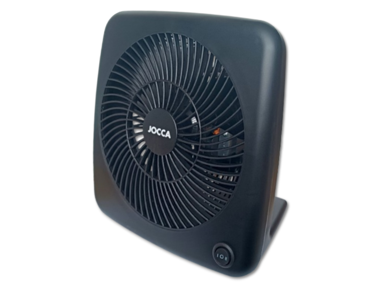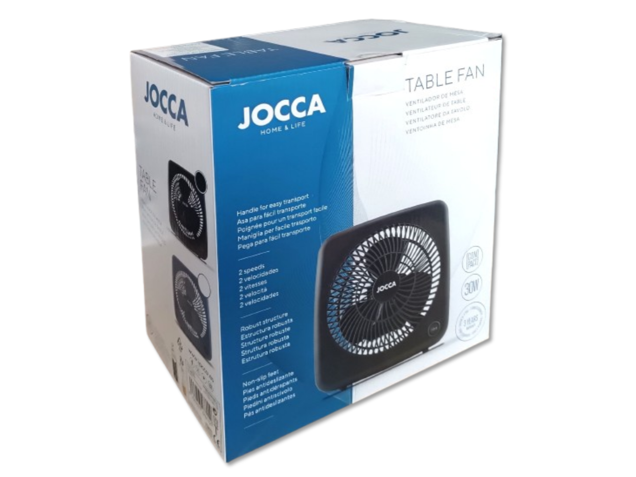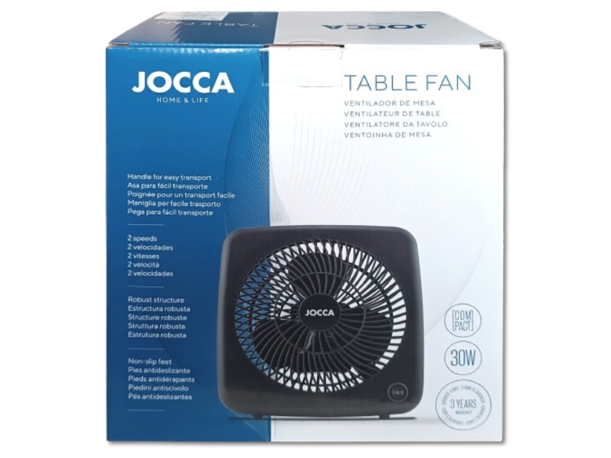 Wiatrak stołowy marki Jocca o mocy 30W z dwustopniową regulacją siły nawiewu. Wiatrak jest sterowany mechanicznie za pomocą przycisku-włącznika. W środkowej pozycji wentylator pozostaje wyłączony, przełączenie włącznika w lewo powoduje uruchomienie wentylatora w trybie normalnym, zaś po przesunięciu włącznika w prawo, przełącza wiatrak w tryb maksymalnych obrotów. Urządzenie posiada uchwyt transportowy, antypoślizgowe nóżki zapewniające stabilność produktu podczas pracy oraz długi 160cm przewód. Wentylator nie wymaga składania, po wyjęciu z opakowania jest gotowy do użytku.