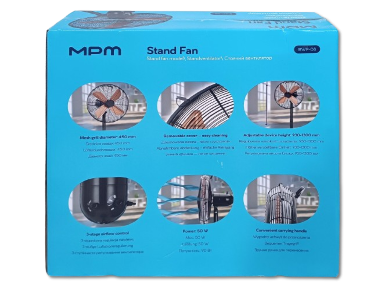 Metalowy wentylator podłogowy marki MPM o mocy 50W i średnicy czaszy 45cm wyposażony w miedziane śmigło. Wiatrak jest sterowany za pomocą pokrętła umożliwiającego trzy stopniową regulacją siły nawiewu. Wentylator posiada zdejmowaną osłonę umożliwia łatwe czyszczenie, oraz wygodny uchwyt transportowy w tylnej części urządzenia. Ponadto produkt wyposażony jest metalową teleskopową rurę, która umożliwia regulację wysokości urządzenia w zakresie 93-130cm, długi 150cm przewód zasilający oraz funkcję automatycznej oscylacji, która zwiększa zasięg nawiewu i pozwala znacznie szybciej schłodzić pomieszczenie. Wentylator wykonany jest z dobrych jakościowo materiałów, metalowa konstrukcja, miedziane śmigło i ciężka podstawa o średnicy 40cm i wadze około 2,2kg zapewniają mu stabilność i bezpieczeństwo w trakcie użytkowania.