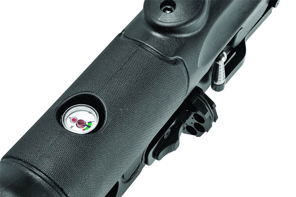 Wyposażenie dodatkowe - dwa metalowe obrotowe bączki do mocowania pasa do broni lub zawieszenia taktycznego. Quick-Fill końcówka do szybkiego napełniania kartusza powietrzem za pomocą pompki butli technicznej / nurkowej (300 bar).