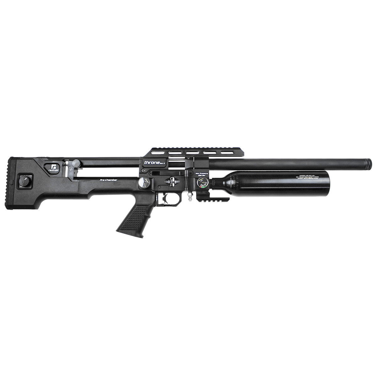 Reximex Throne Gen2, nowoczesna wiatrówka PCP w znanej z przesunięcia komory i magazynika za spust wersji Bullpup. Poprzez zastosowanie układu bezkolbowego, uzyskano kompaktowe wymiary karabinu, przy zachowaniu normalnej długości lufy gwarantującej celność i zasięg oraz typową dla tej konstrukcji redukcję wagi dla lepszej kontroli. Throne Gen2 wyposażono w dźwignię napinania Side Lever, regulator mocy strzału, pokrętło regulacji mechanizmu spustowego oraz lufę ze zintegrowanym tłumikiem dźwięku. Dostępny w kalibrach: .177 (4.5 mm), .22 (5.5 mm), .25 (6.35 mm).