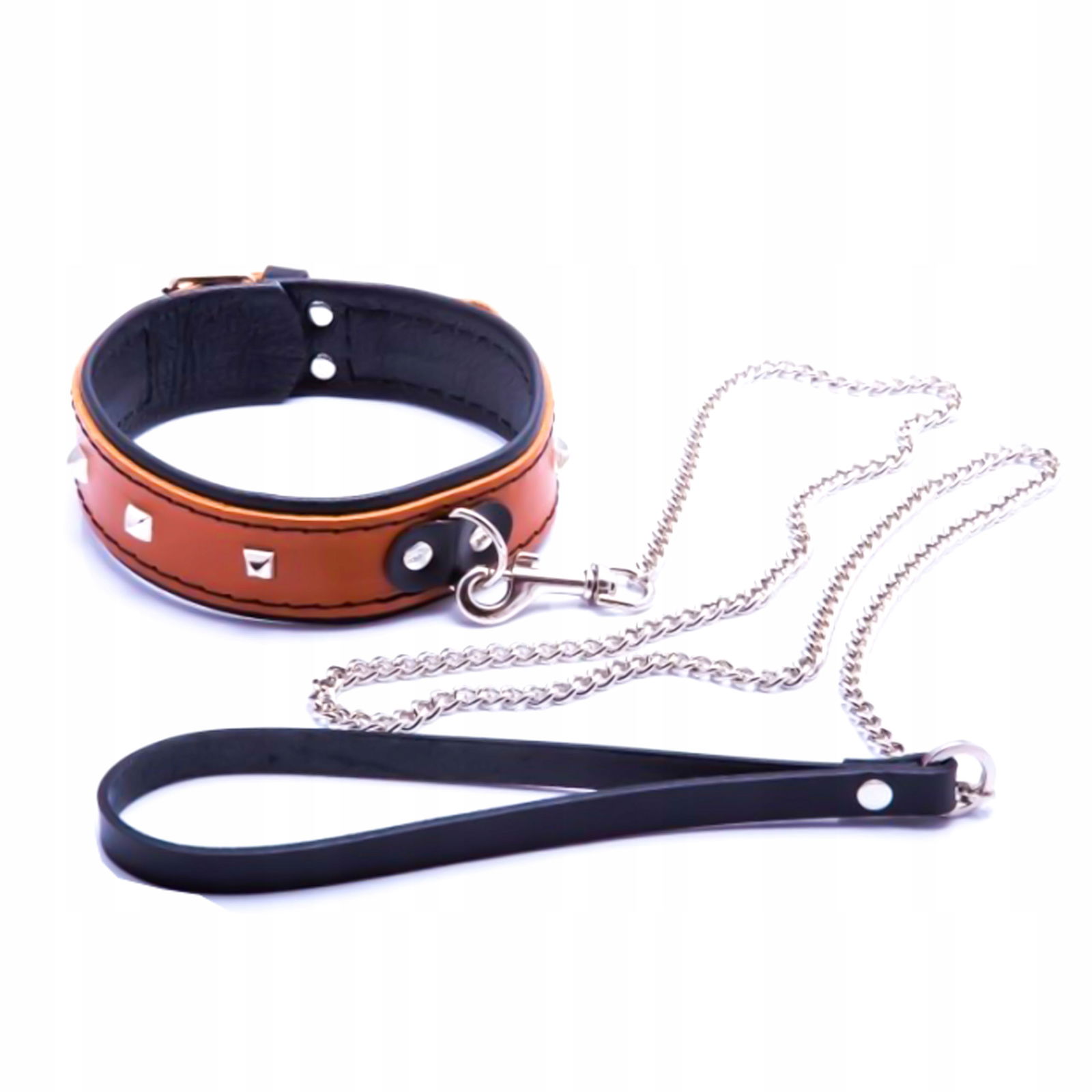 Skórzana obroża damska w kolorze koniakowym, nabijana ćwiekami ze smyczą.Obroża jest zapinana na masywną klamrę z możliwością regulacji rozmiaru.Długość smyczy ok. 90cmProdukt został wykonany bardzo starannie z naturalnej skóry bydlęcej. Skóra ta wyprawiana jest metodą tradycyjną, garbnikami roślinnymi w najstarszej czynnej w Polsce garbarni. Skóra ta jest bardzo mocna, a jednocześnie delikatna w dotyku, a ponadto charakteryzuje si ę ekscytującym zapachem. Posiada unikatową cechę dostosowywania się do kształtu ciała i z biegiem czasu nabiera szlachetności. Produkt bardzo dobry gatunkowo.Wyprodukowano w Polsce.