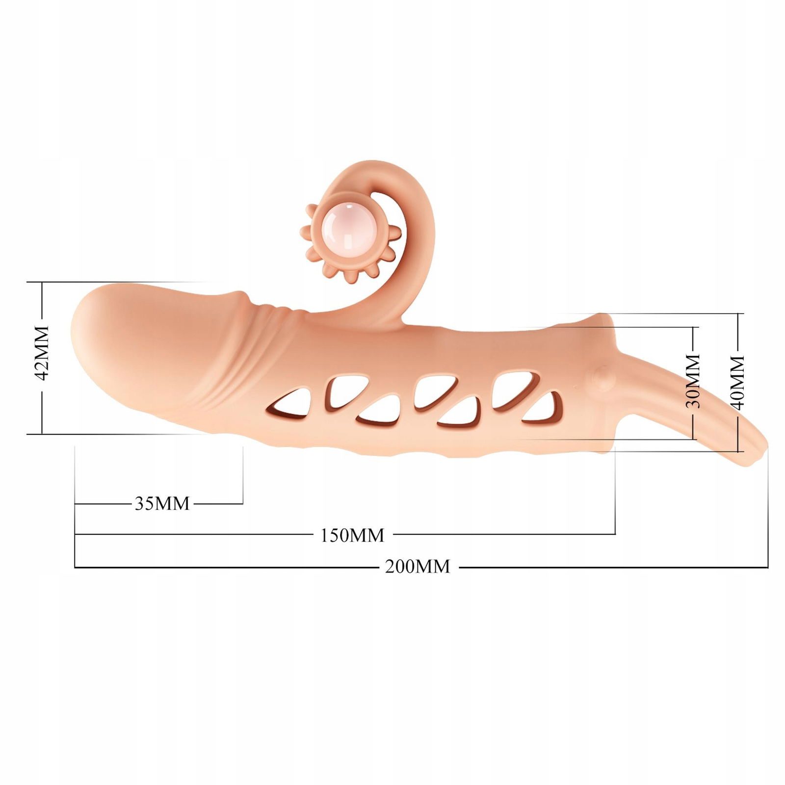 • Łatwość Zakładania: Przedłużka jest prosta w użyciu, elastyczna i łatwa do nałożenia, pasując do większości rozmiarów penisa.