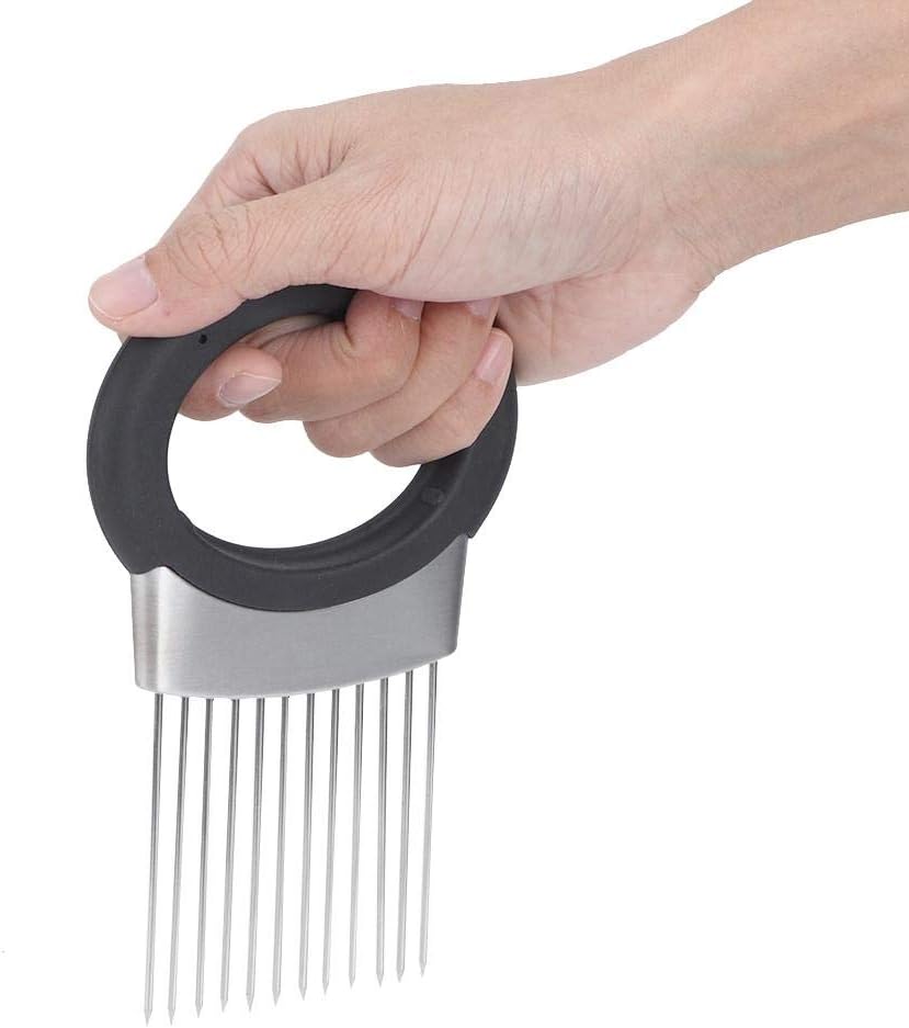 Wysokiej jakości i bezpieczne materiały. Uchwyt do cebuli --- krajalnica do warzyw jest wykonana z materiału ABS i wysokiej jakości stali nierdzewnej. Krajalnica do owoców i warzyw nadaje się do owoców i warzyw.