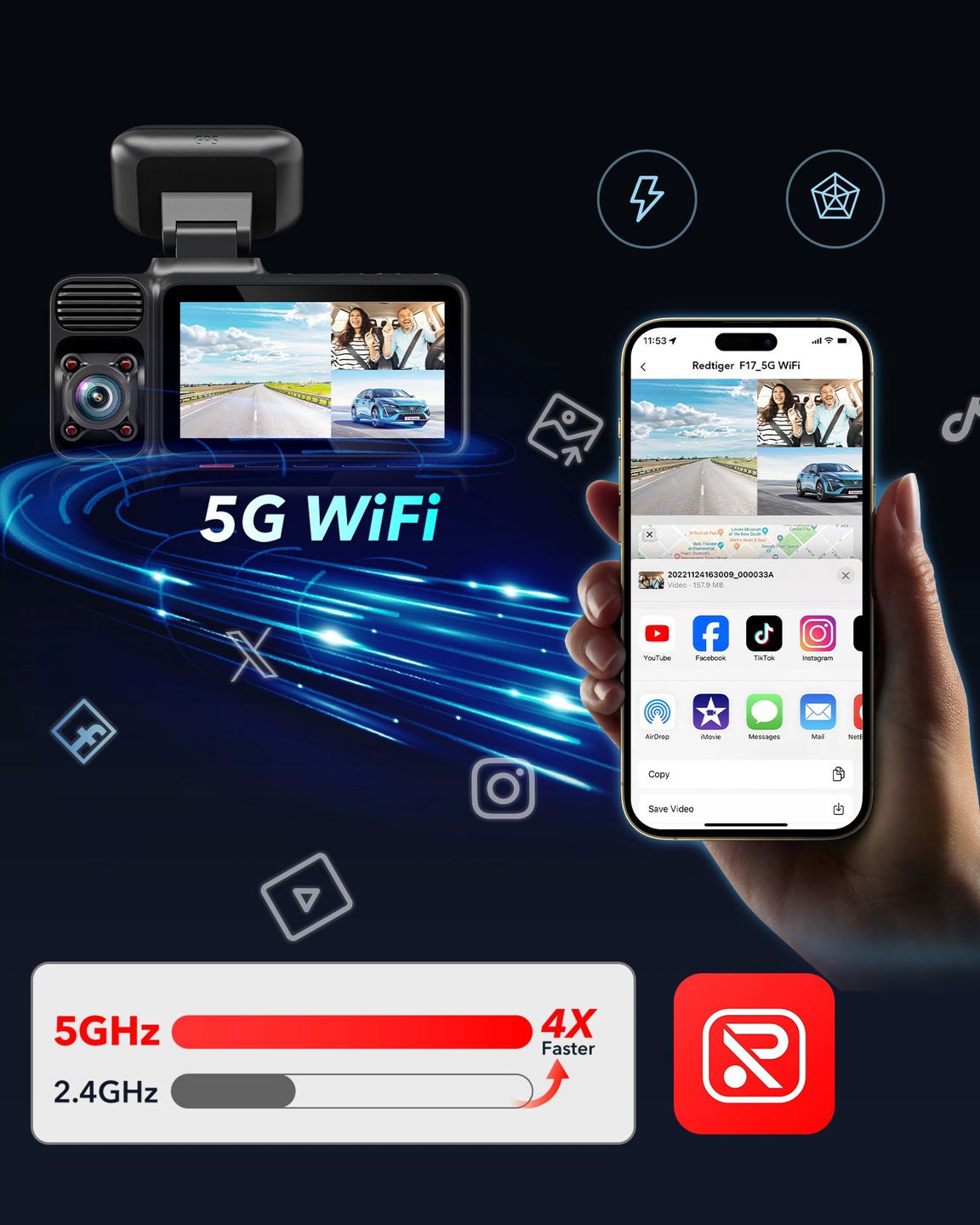 ☑ Ulepszone WiFi 5 GHz & GPS – połącz się z aplikacją REDTIGER, aby przeglądać materiał w czasie rzeczywistym, śledzić trasy i udostępniać filmy bez wysiłku. Odtwarzaj wszystkie trzy kanały jednocześnie, aby uzyskać pełną kontrolę.