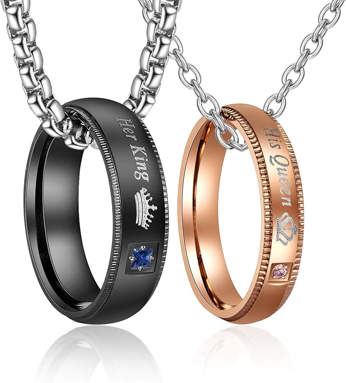 Gkmamrg para damskich i męskich pierścionków, łańcuszki dla par, stal nierdzewna, pierścionki partnerskie z grawerunkiem His Queen i Her King, srebrny łańcuszek na szyję, stal nierdzewna.