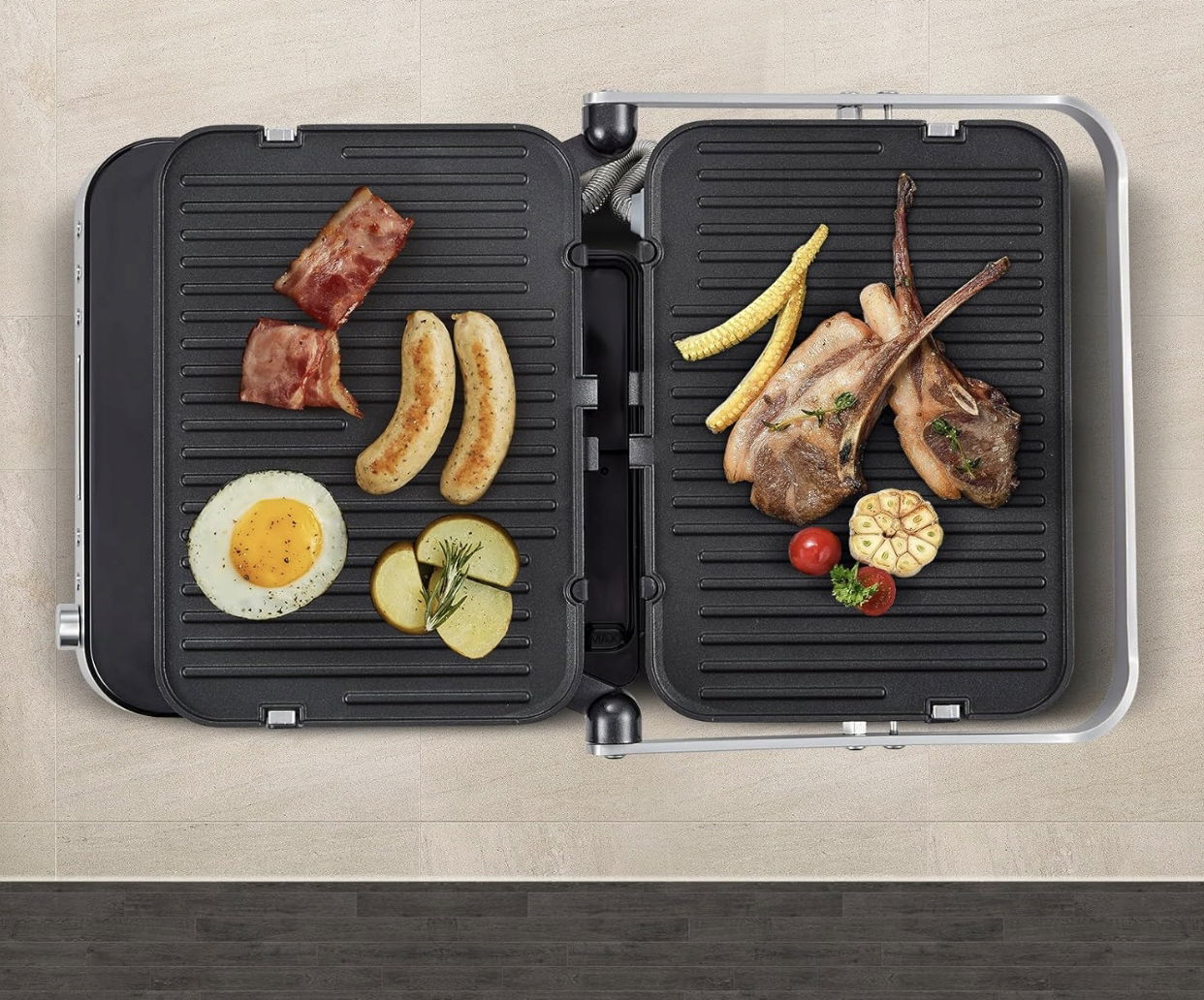 Wyjmowane płyty z powłoką zapobiegającą przywieraniu, regulowany czas i temperatura oraz nowoczesny panel LED sprawiają, że gotowanie jest szybkie, wygodne i bezpieczne.