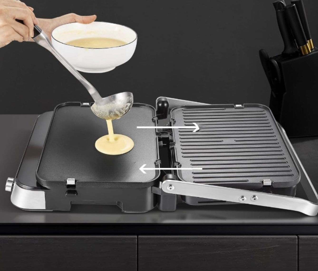 Grill jest wyposażony w funkcję jednostronnego/dwustronnego ogrzewania, 2 płyty waflowe i 2 wyjmowane płyty (paski lub gładkie) mogą być używane w dowolnej kombinacji, aby przekształcić go w wybraną maszynę: