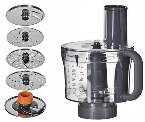 - Wyposażony w ostrze do siekania oraz zestaw 5 tarcz ze stali nierdzewnej do krojenia w plasterki, tarcia, ścierania np. na placki i cięcia w słupki julienne warzyw i owoców i przystawkę do krojenia w kostkę.
