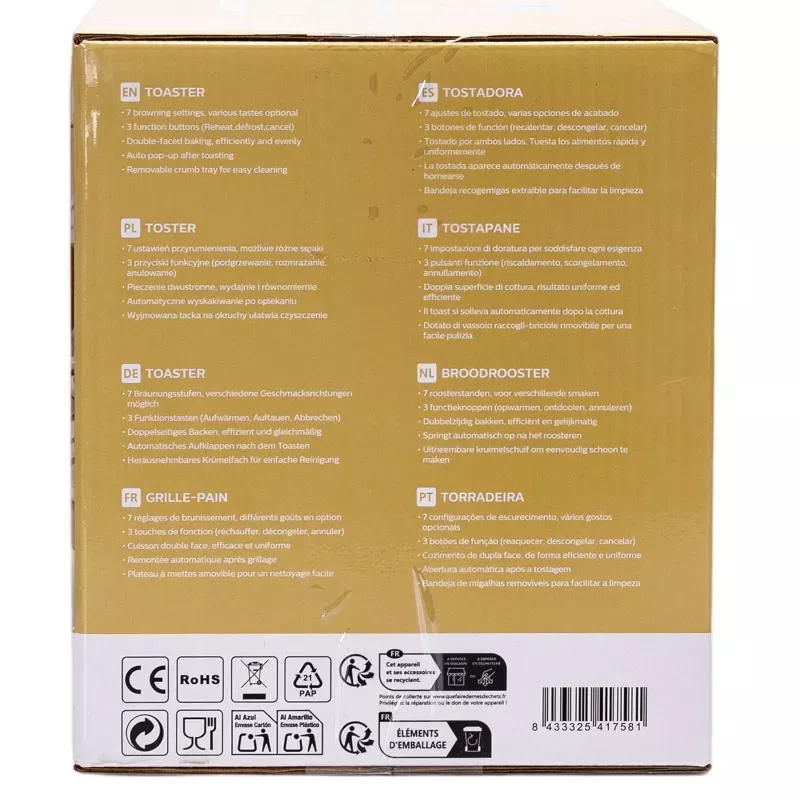 7 ustawień opiekania, różne smaki do wyboru. 3 przyciski funkcyjne (podgrzewanie, rozmrażanie, anulowanie). Dwustronne pieczenie, wydajne i równomierne. Automatyczne wysuwanie po opiekaniu. Wyjmowana tacka na okruchy ułatwiająca czyszczenie. Konstrukcja zwijania przewodu ułatwiająca przechowywanie