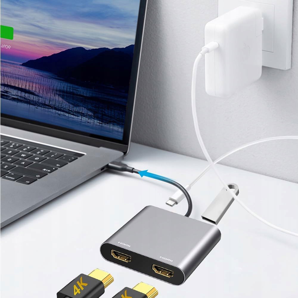 【Adapter HDMI 4 w 1】 - Adapter USB C na podwójne HDMI umożliwia podłączenie urządzeń z portami interfejsu USB-C do dwóch portów HDMI, jednego portu USB 3.0 i jednego portu PD. Wszystkie cztery porty mogą pracować jednocześnie. Zaprojektowany dla urządzeń z portami typu C lub portami Thunderbolt 3, które obsługują tryby wyjścia wideo i audio.