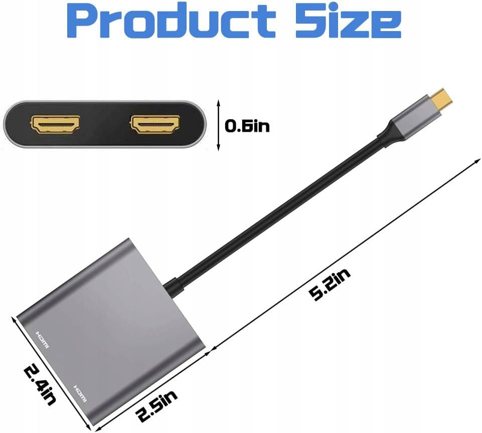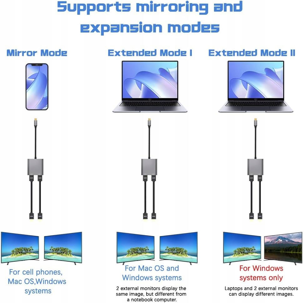 【WAŻNA UWAGA】 - W przypadku tego adaptera 2 HDMI USB C na podwójne HDMI maksymalna rozdzielczość może wynosić 4K przy 60 Hz przy użyciu samego 1 złącza HDMI lub 4K przy 30 Hz przy użyciu 2 portów HDMI. Tryb rozszerzony obsługuje systemy Windows, które przesyłają strumieniowo różne obrazy na trzy monitory. Ze względu na ograniczenia systemu MacOS za pomocą adaptera USB c na podwójne hdmi nie można rozszerzyć dwóch różnych ekranów. Można używać wyłącznie trybu lustrzanego.