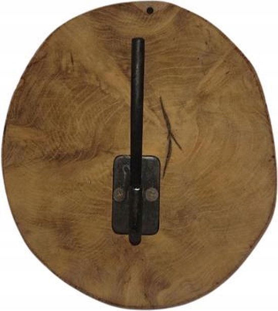 Naturalny plaster drewna tekowego na którym przykręcony został czarny metalowy haczyk.
