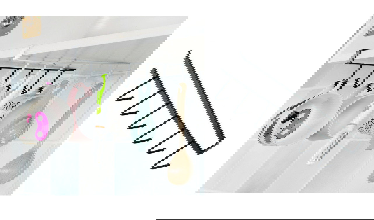 Odkryj sprytny sposób na organizację przestrzeni! Ten uniwersalny wieszak pozwala wykorzystać wolne miejsce pod półkami w kuchni, szafie czy łazience. Dzięki niemu zyskujesz dodatkowe miejsce na akcesoria bez konieczności wiercenia dziur.