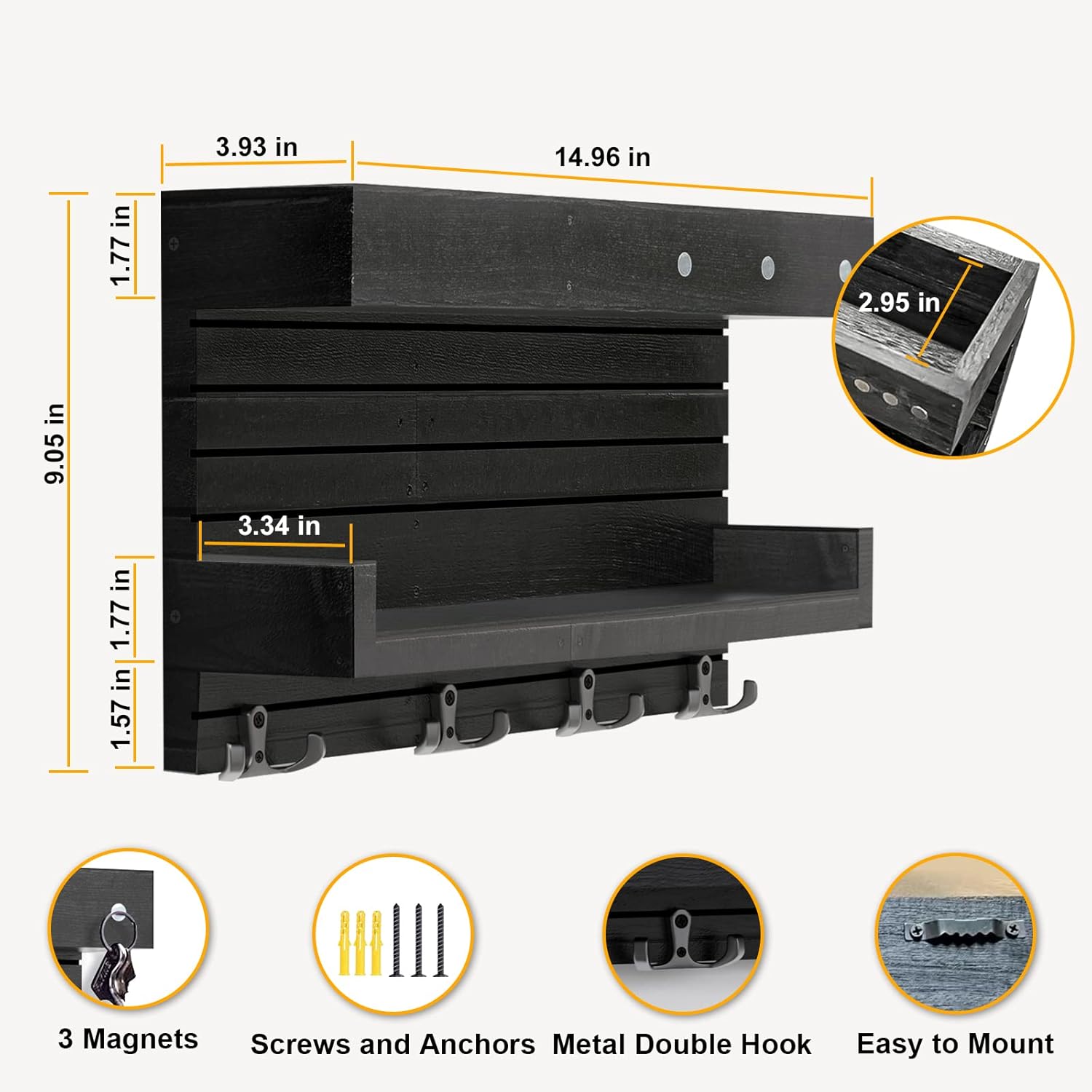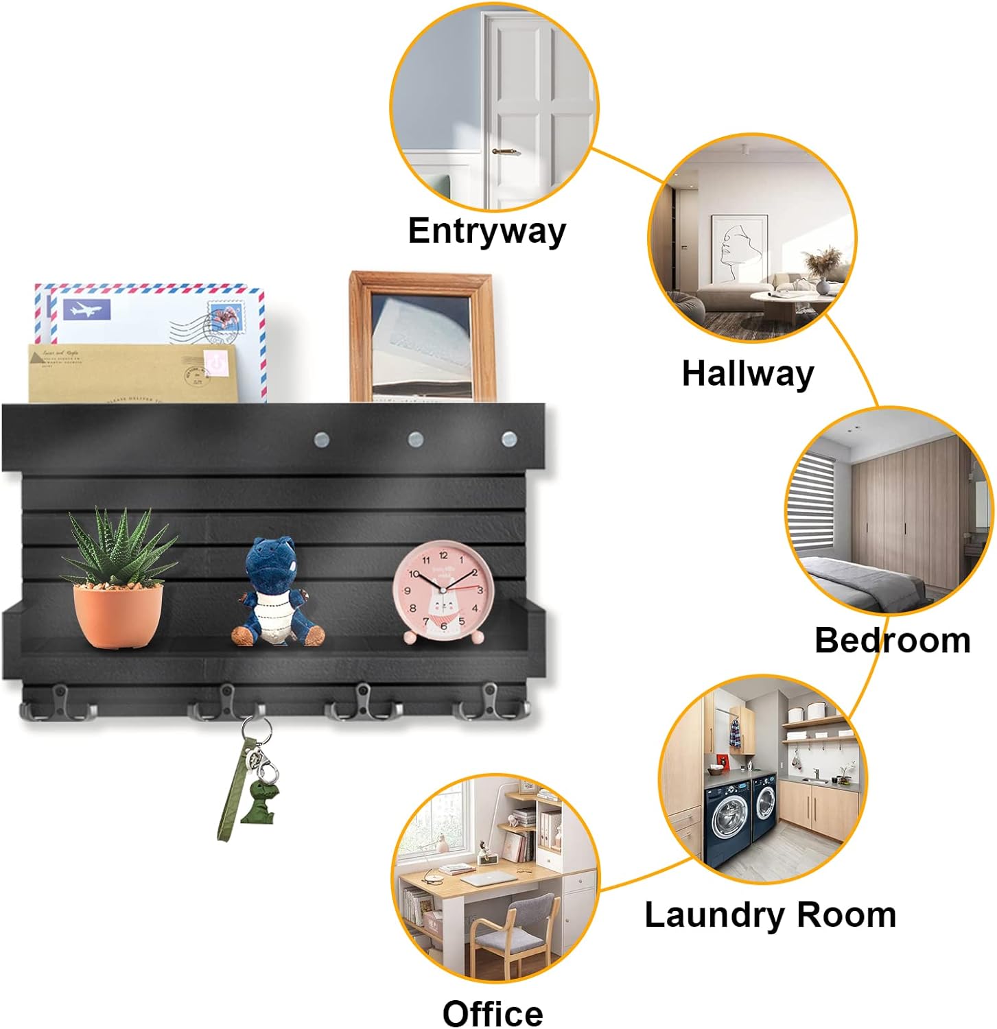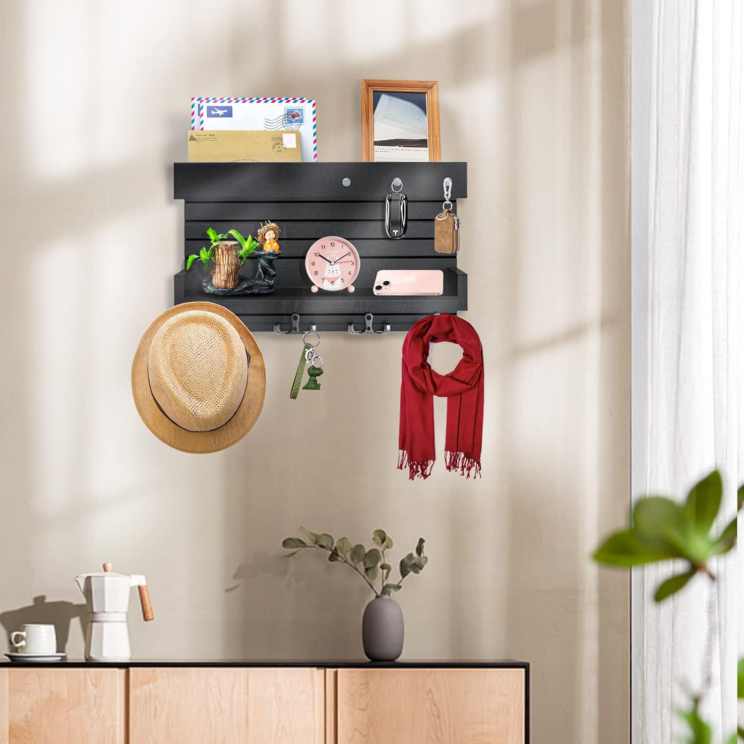 - WSZECHSTRONNE PRZECHOWYWANIE POCZTY I WIĘCEJ: Koniec z martwieniem się o zgubienie kluczy lub poczty! Na górnym poziomie pływającej półki z płytą rozpraszającą możesz przechowywać pocztę, rachunki, listy, gazety, czasopisma itp. Kolejna pływająca półka przechowuje torebki, okulary przeciwsłoneczne, akcesoria, małe rośliny i wiele więcej. 4 metalowe podwójne haczyki i 3 magnetyczne haczyki na klucze do wieszania kluczy, parasola, płaszcza i czapki, smyczy dla psa itp.