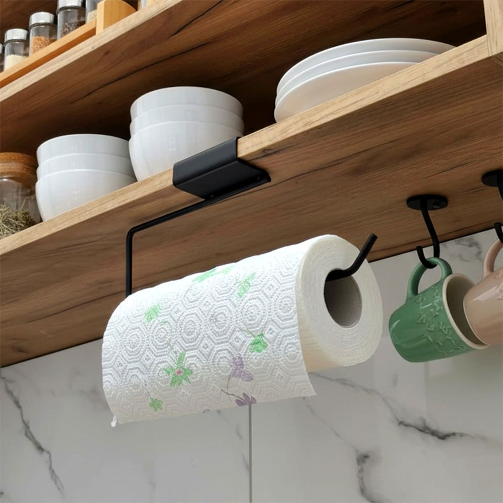 Wieszak kuchenny na ręczniki papierowe. Wykonany z metalu w czarnym kolorze. Łatwy montaż bez wiercenia, wystarczy wsunąć na półkę szafki.