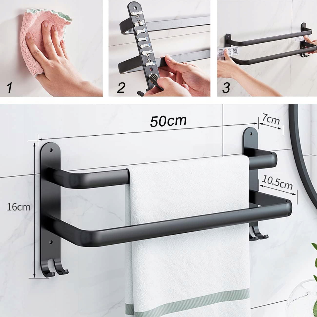 - Uchwyt na ręczniki z haczykiem o matowoczarnej powierzchni, który pasuje do różnych stylów wystroju wnętrz, oszczędza miejsce i sprawia, że łazienka wygląda świeżo.