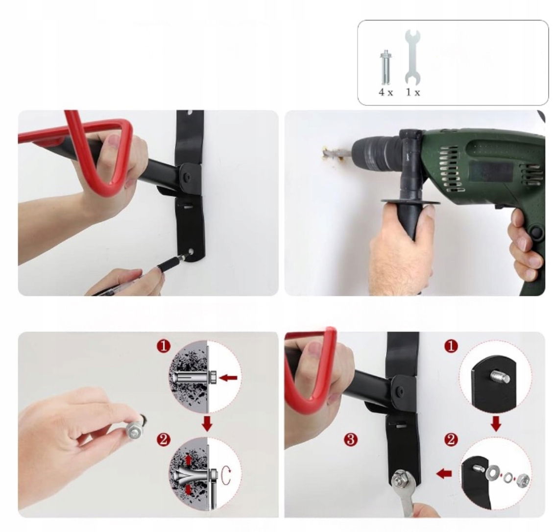 Równoległy ze ścianą, nie przeszkadza w garażu i szopie wewnętrznej. Niezbędne narzędzie oszczędzające miejsce do sklepu rowerowego, narożnika szopy, garażu, wiaty lub mieszkania. Wystarczy powiesić i odłączyć rower w kilka sekund.