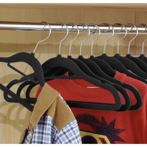 - WYSOKA JAKOŚĆ - wieszaki są wykonane z plastiku i w całości pokryte przyjemnym w dotyku welurem, dzięki czemu ubrania nie zsuwają się. Dodatkowo każdy wieszak posiada uchwyt na krawat, pasek czy apaszkę oraz ma wgłębienia na tasiemki.