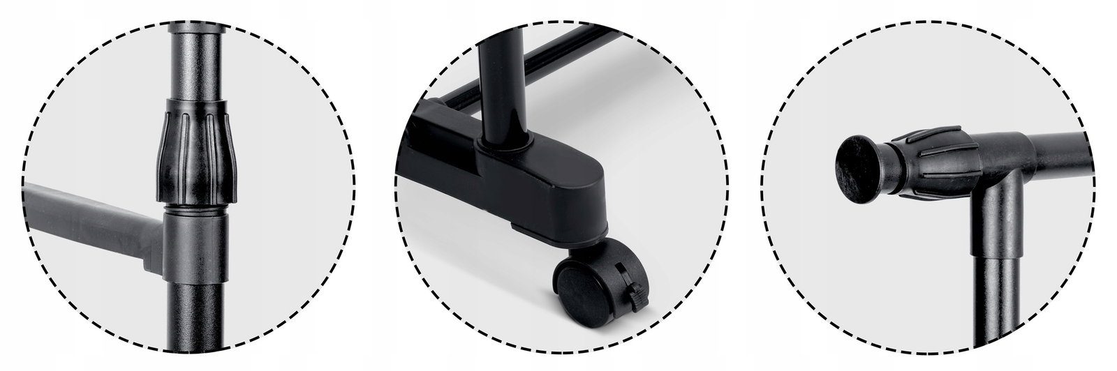 - Mobilność: Wyposażony w cztery kółka z blokadą, wieszak jest łatwy do przemieszczenia, co pozwala na jego wygodne użytkowanie w różnych pomieszczeniach. Kółka umożliwiają płynne przesuwanie, a blokada zapewnia stabilność, gdy wieszak jest w miejscu.