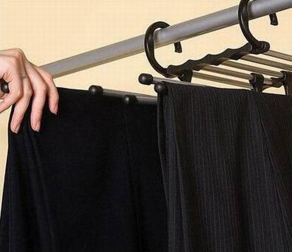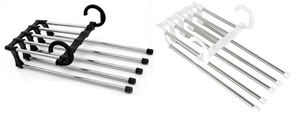 Metalowy wieszak pomieści aż 5 par spodni. Może zostać powieszony na dwóch lub jednym haku. Dwa haki pozwalają na wysunięcie wieszaka z szafy bez konieczności zdejmowania całego. Jeden hak pozwoli zaoszczędzić Ci więcej miejsca w szafie. Wieszak jest najwygodniejszym sposobem na przechowywanie spodnie. Pozwoli Ci zachować porządek w szafie, a spodnie nie ulegną pognieceniu.
