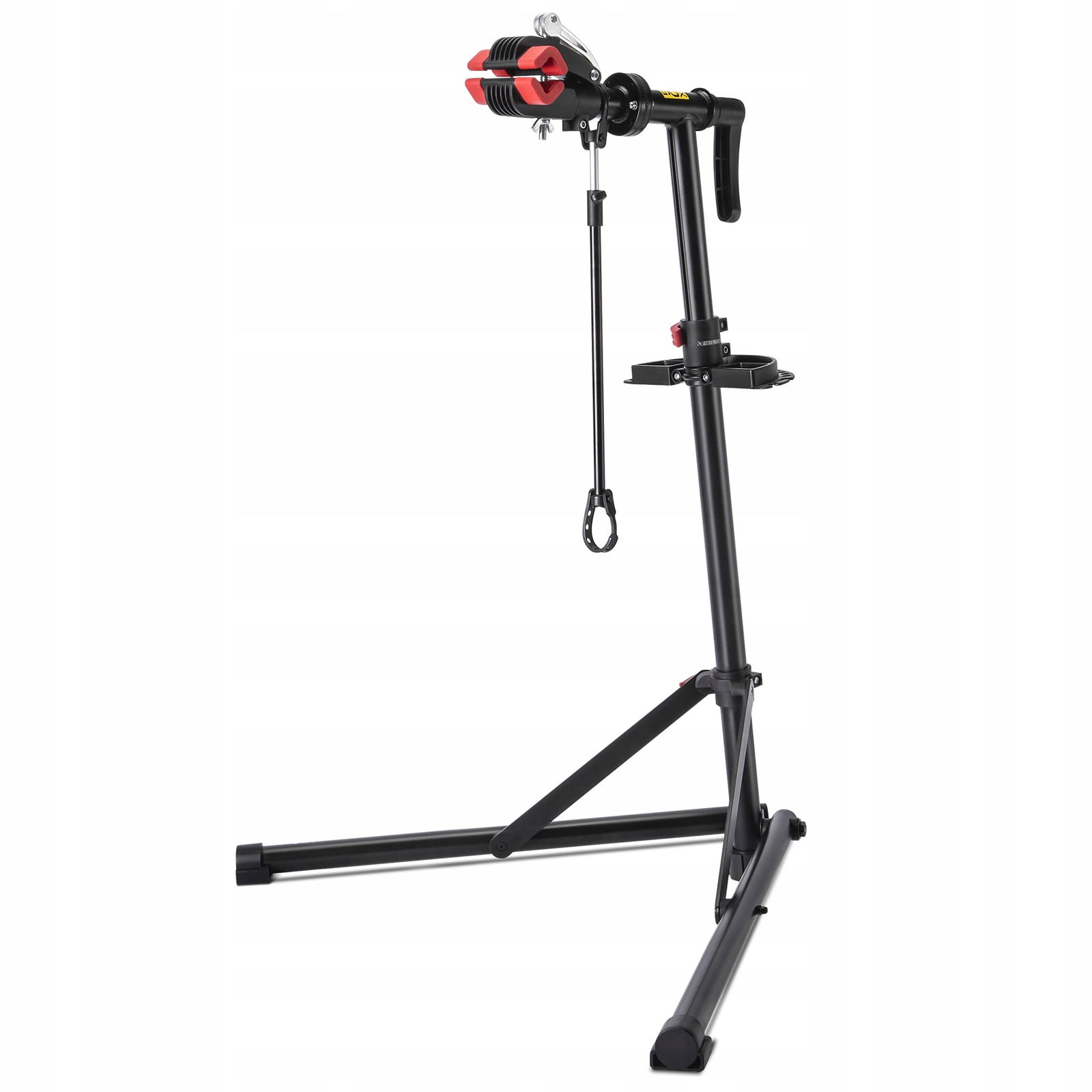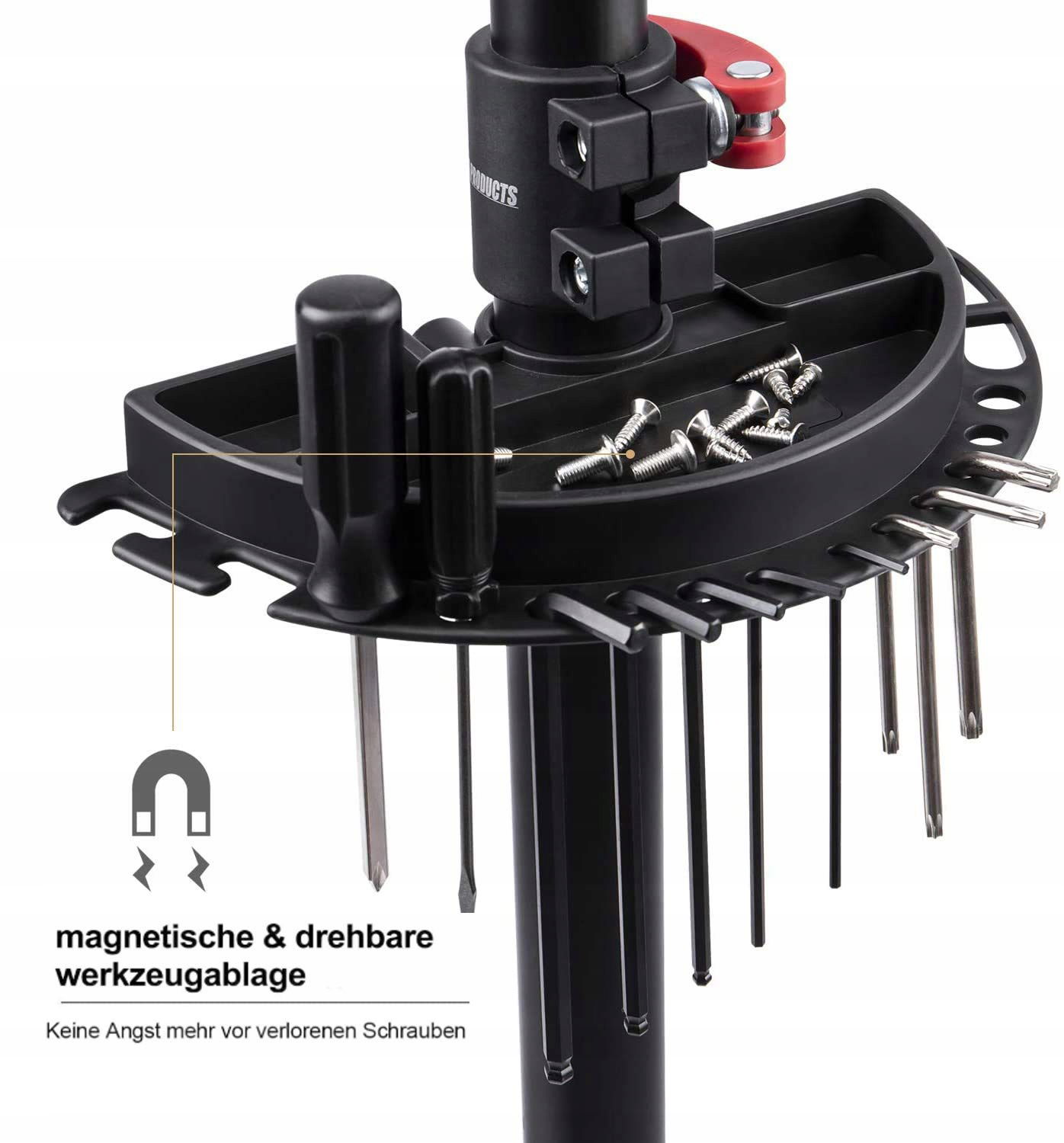 Obracany o 360° zacisk i korpus z regulacją wysokości – zacisk z dźwignią może bardzo stabilnie zamocować rower. Dzięki drążkowi teleskopowemu stojak montażowy jest regulowany na wysokość, dzięki czemu Twoja talia jest przyjemna podczas naprawy.