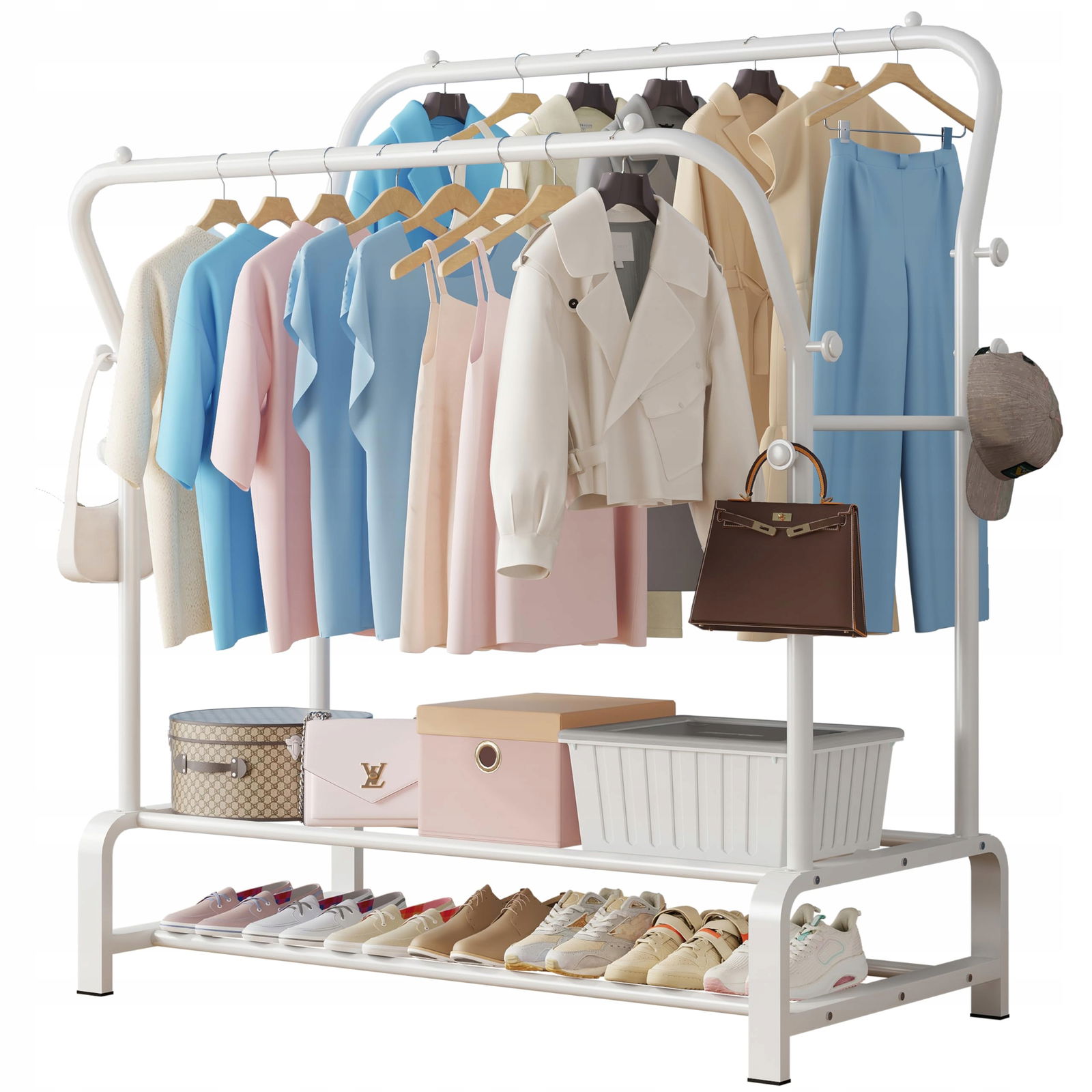 Wieszak na ubrania, wielofunkcyjny, wolnostojący, podwójny wieszak na ubrania do sypialni, stabilny drążek na ubrania z 8 haczykami i 2 półkami na buty, metalowy, biały
