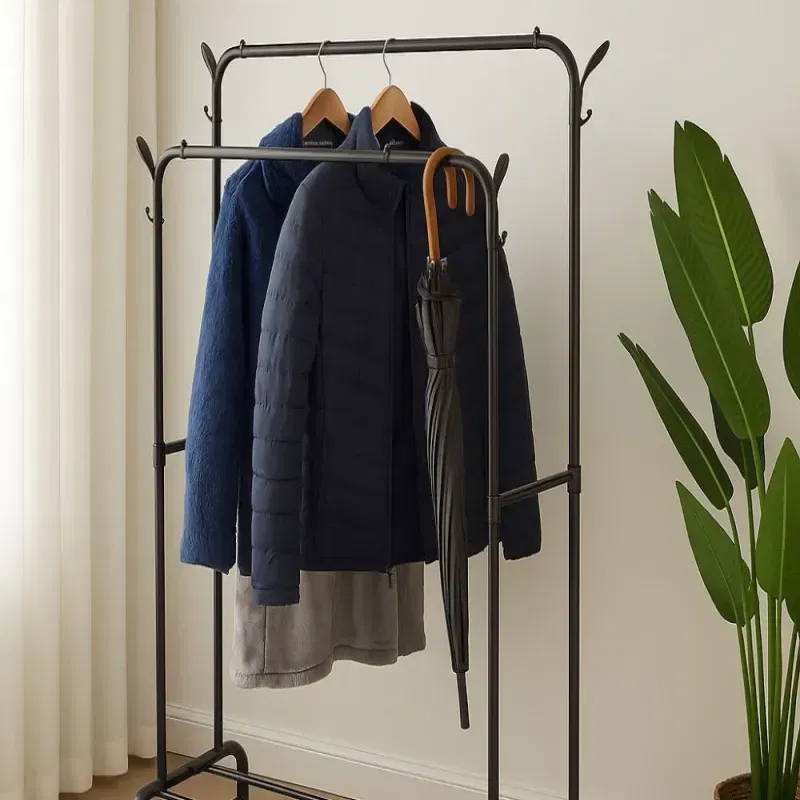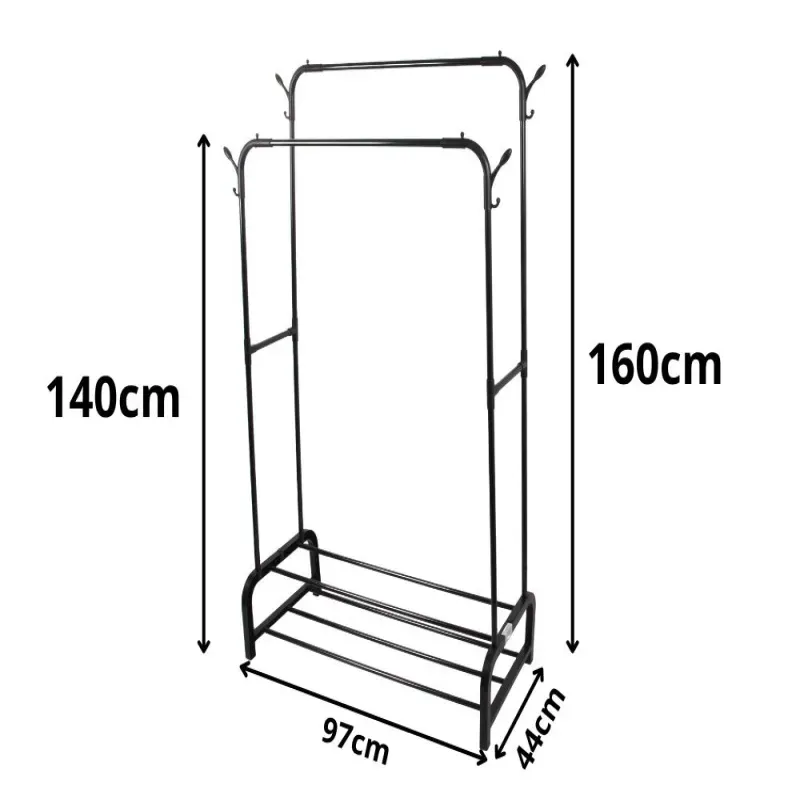 Ten solidny wieszak stojący na ubrania to doskonałe rozwiązanie do przechowywania odzieży wierzchniej, koszul, kurtek czy płaszczy. Dzięki podwójnym drążkom oraz dolnym półkom umożliwia wygodne rozmieszczenie ubrań, butów i dodatków w jednym miejscu.