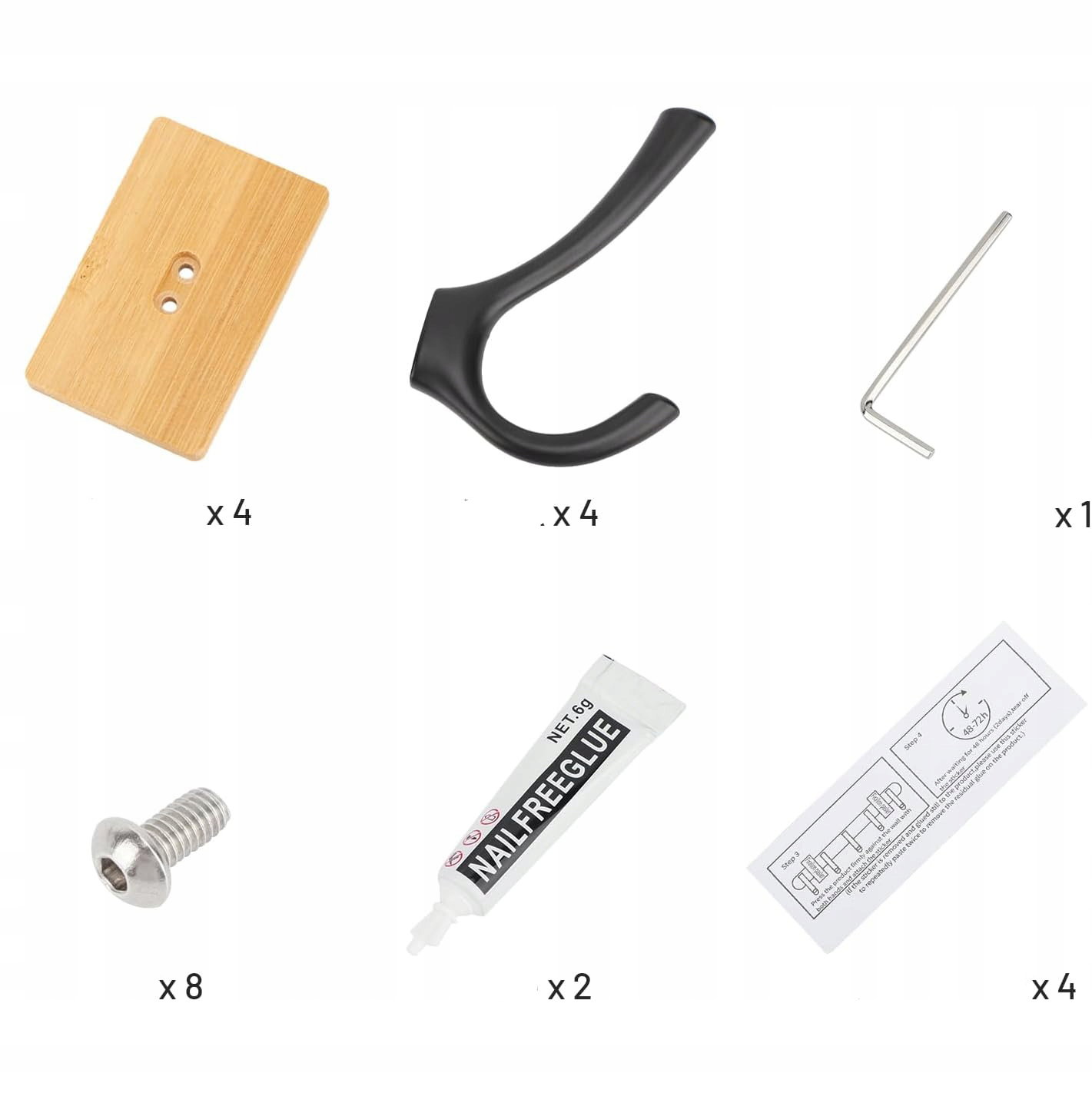 Zawartość zestawu: 4 x bambusowa podstawa, 4 x hak, 1 x klucz imbusowy, 8 x śruba, 4 x naklejka pomocnicza, 2 x klej montażowy