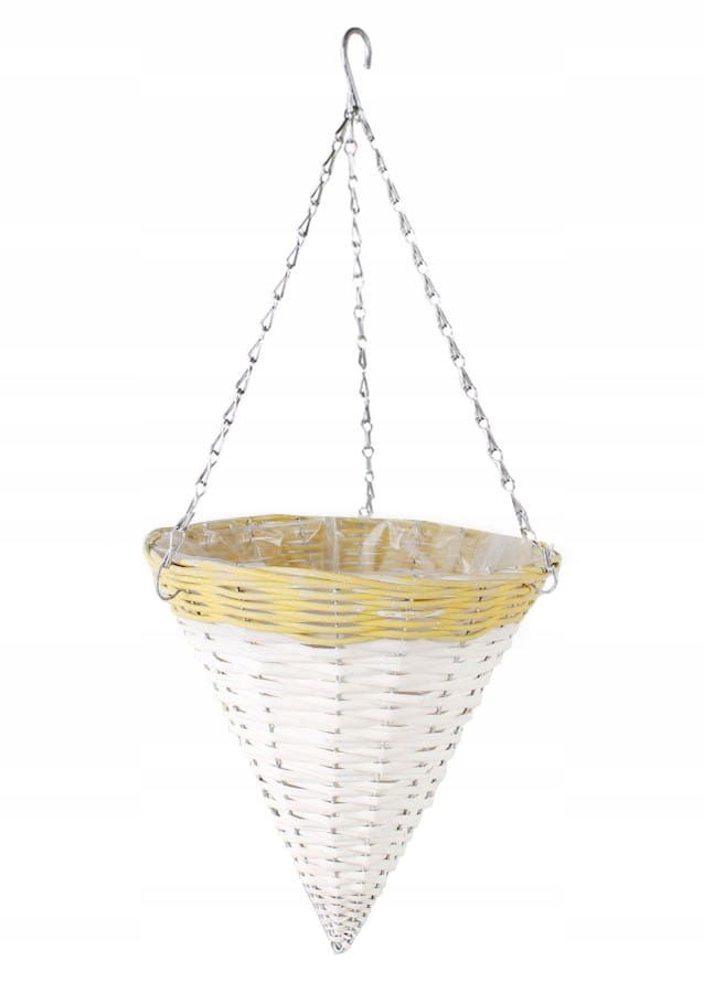 Przeznaczenie: wiszący kosz na balkon, kosz wiszący wiklinowy na kwiaty, zwis wiklinowy do ogrodu, stożek wiklinowy z folią, ogrody wiszące Specyfikacja