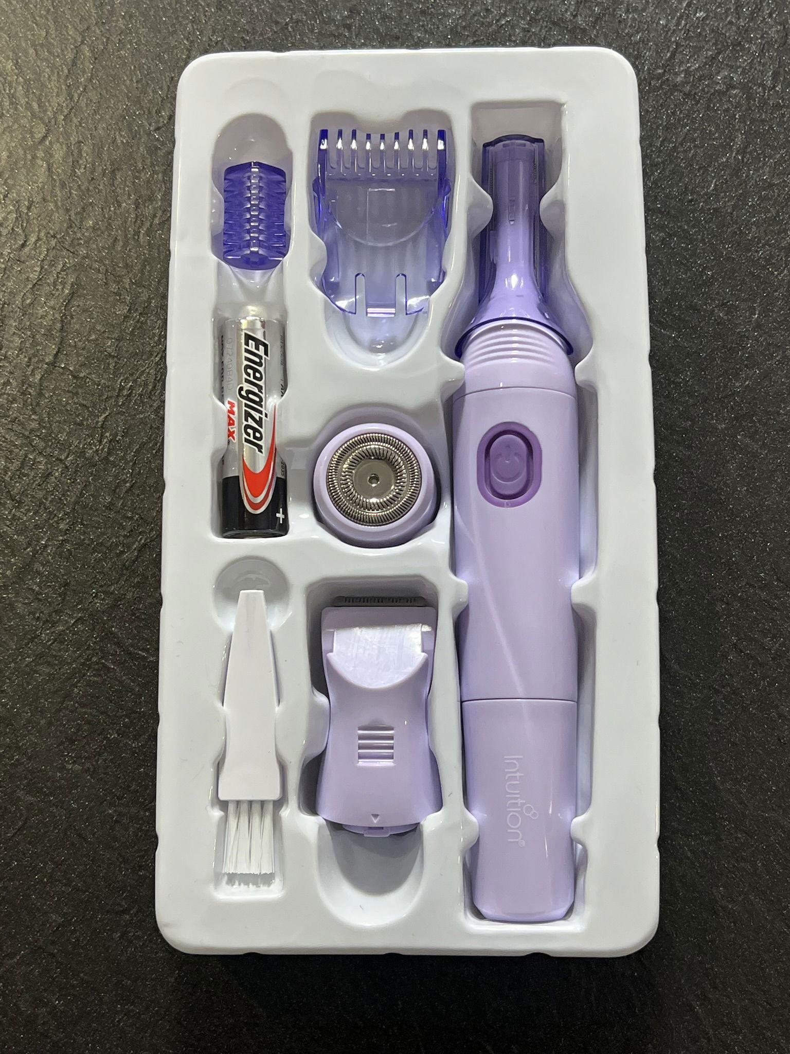 W zestawie: trymer, 1 końcówka do usuwania owłosienia z twarzy, 1 końcówka z grzebykiem do okolic bikini, 1 końcówka z grzebykiem do kształtowania brwi oraz nasadka, 1 szczoteczka, 1 bateria AA.