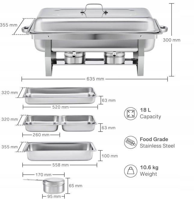 - ✴️Stal nierdzewna klasy spożywczej: Nasze naczynia Chafing Dishes dla gastronomii są wykonane ze stali nierdzewnej o jakości spożywczej, aby spełnić Twoje wymagania dotyczące najwyższej wytrzymałości i higieny żywności. Te podgrzewacze do potraw są wyjątkowo odporne na zarysowania, plamy, zużycie i zapachy i pozostają nieskazitelne jak pierwszego dnia.