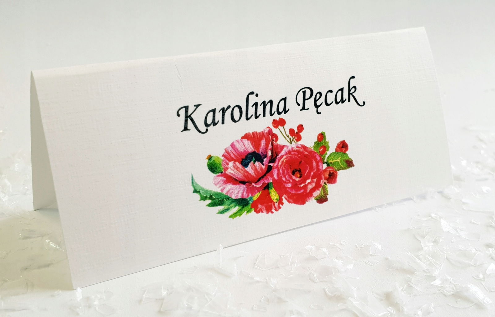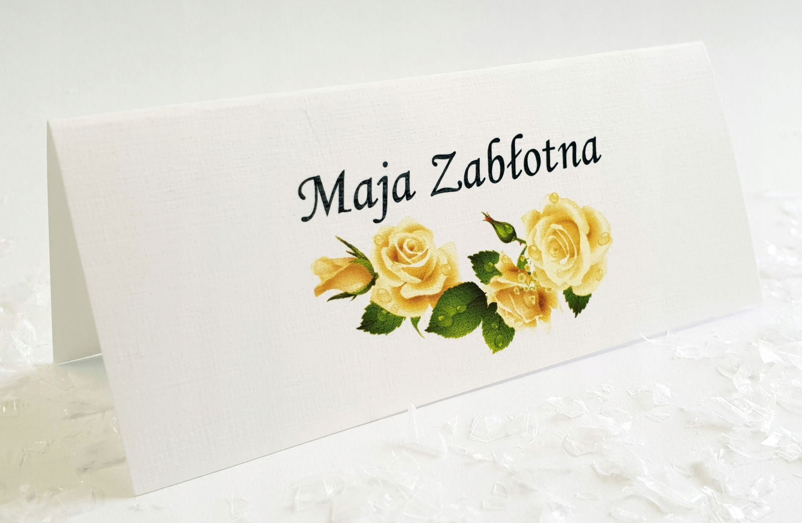 Winietki drukujemy dla Was na wysokiej jakości papierze , o gramaturze 246g/m2, dzięki czemu stabilnie będą stały na Waszych stołach!