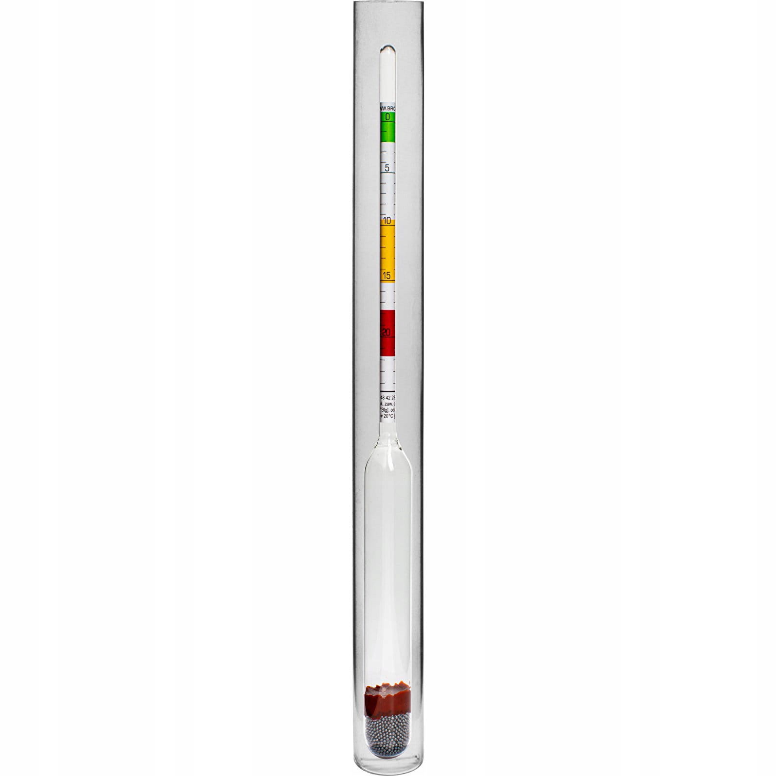 Sposób użycia: W celu dokonania pomiaru w probówce umieść areometr i wlej płyn pozbawiony cząstek stałych oraz pęcherzyków gazu. Ilość płynu powinna być taka, aby umieszczony w probówce pływak unosił się swobodnie i nie dotykał ścianek zbiorniczka. Wartość stężenia cukru wskazuje odczyt górny. Patrz instrukcja. Po dokonaniu pomiaru płyn wylej, nie spożywaj.