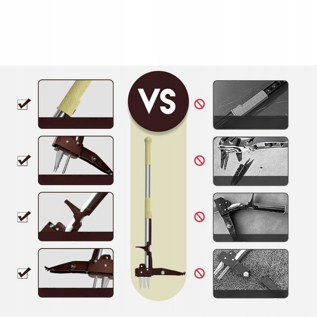 - Zastosowanie: narzędzie służy do usuwania chwastów wraz z korzeniami z gleby w sposób wygodny i bez konieczności schylania się. Umożliwia szybkie i skuteczne oczyszczanie trawników, ogrodów oraz rabat z niepożądanych roślin. Pomaga utrzymać porządek w przestrzeni zielonej bez użycia środków chemicznych.