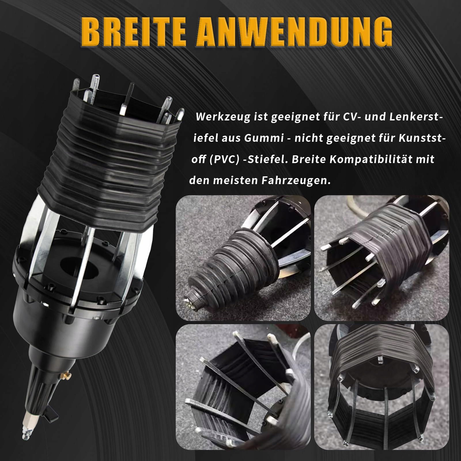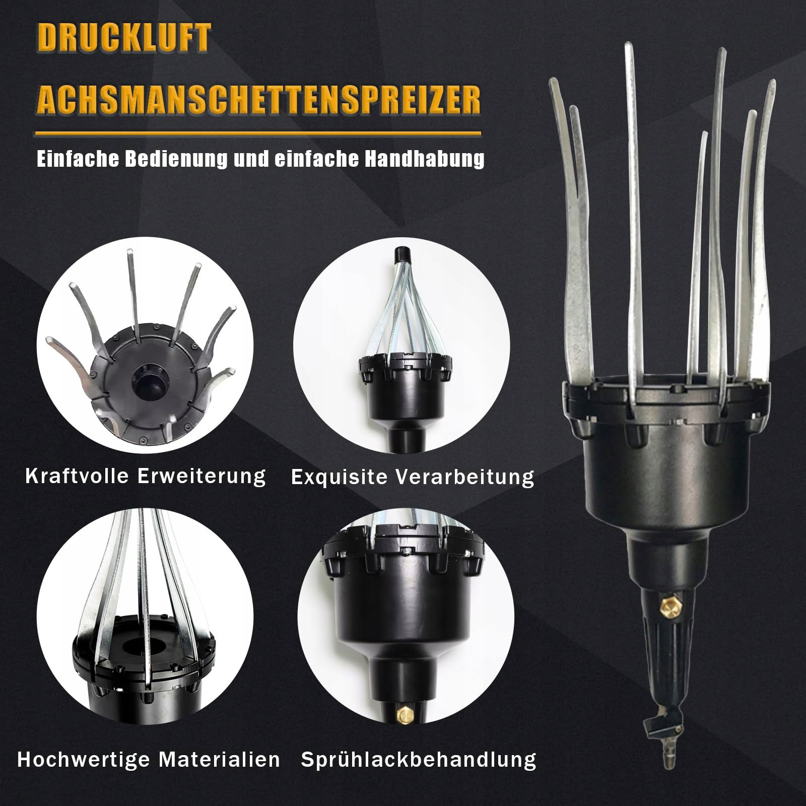 WINTOOLS Uniwersalny pneumatyczny rozpieracz osłony przegubu homokinetycznego to profesjonalne narzędzie zaprojektowane do szybkiego i bezproblemowego montażu osłon przegubów homokinetycznych. Obsługa jest niezwykle prosta — wystarczy podłączyć urządzenie do sprężarki powietrza i jednym przyciskiem rozszerzyć osłonę, umożliwiając jej łatwe nałożenie na przegub.