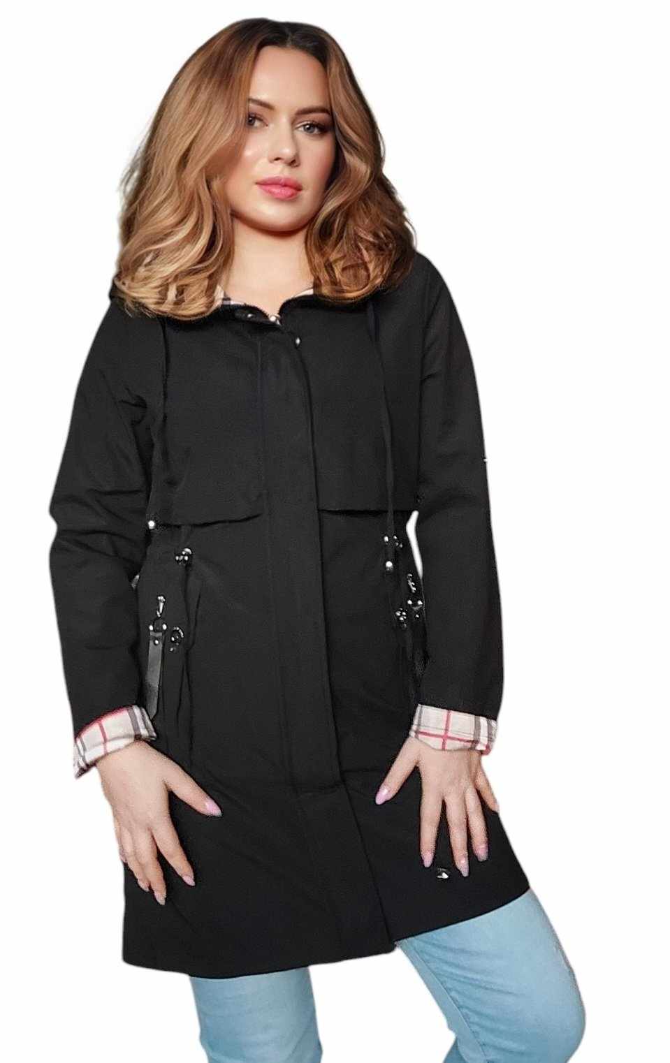 🔹 Kaptur i modne akcenty z kraty – stylowe detale dodają charakteru i podkreślają wyjątkowy design płaszcza.