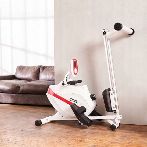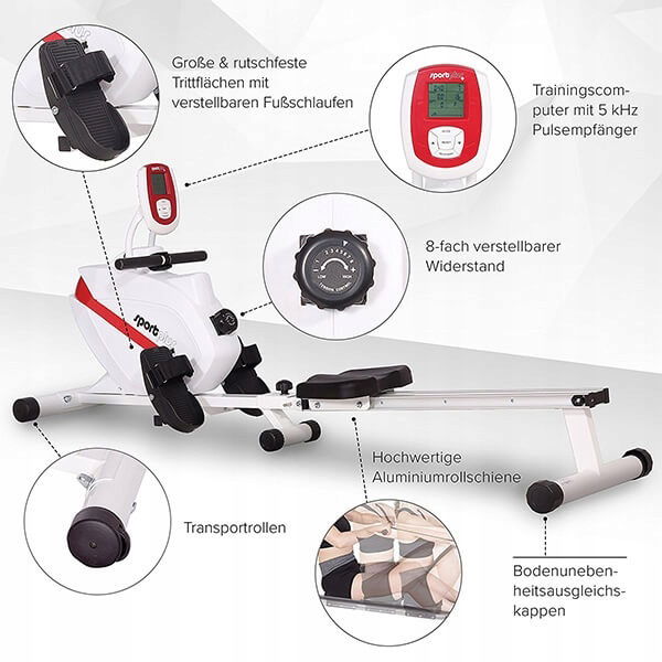 - SportPlus SP-MR-108 można łatwo transportować i przechowywać dzięki składanej konstrukcji i rolkom transportowym przymocowanym z przodu.