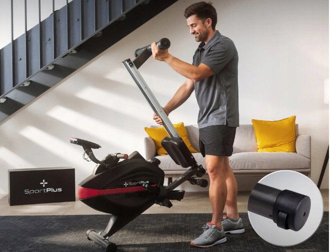 - SportPlus SP-MR-108 można łatwo transportować i przechowywać dzięki składanej konstrukcji i rolkom transportowym przymocowanym z przodu.