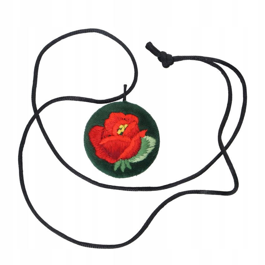 Wisiorek haftowany łowicki z czerwoną różą (na zielonym tle)