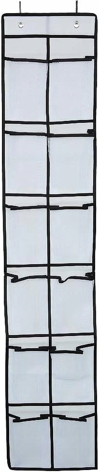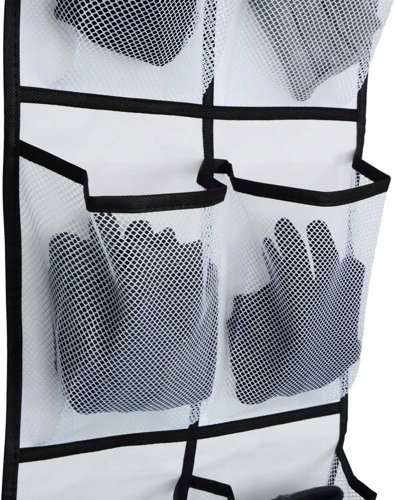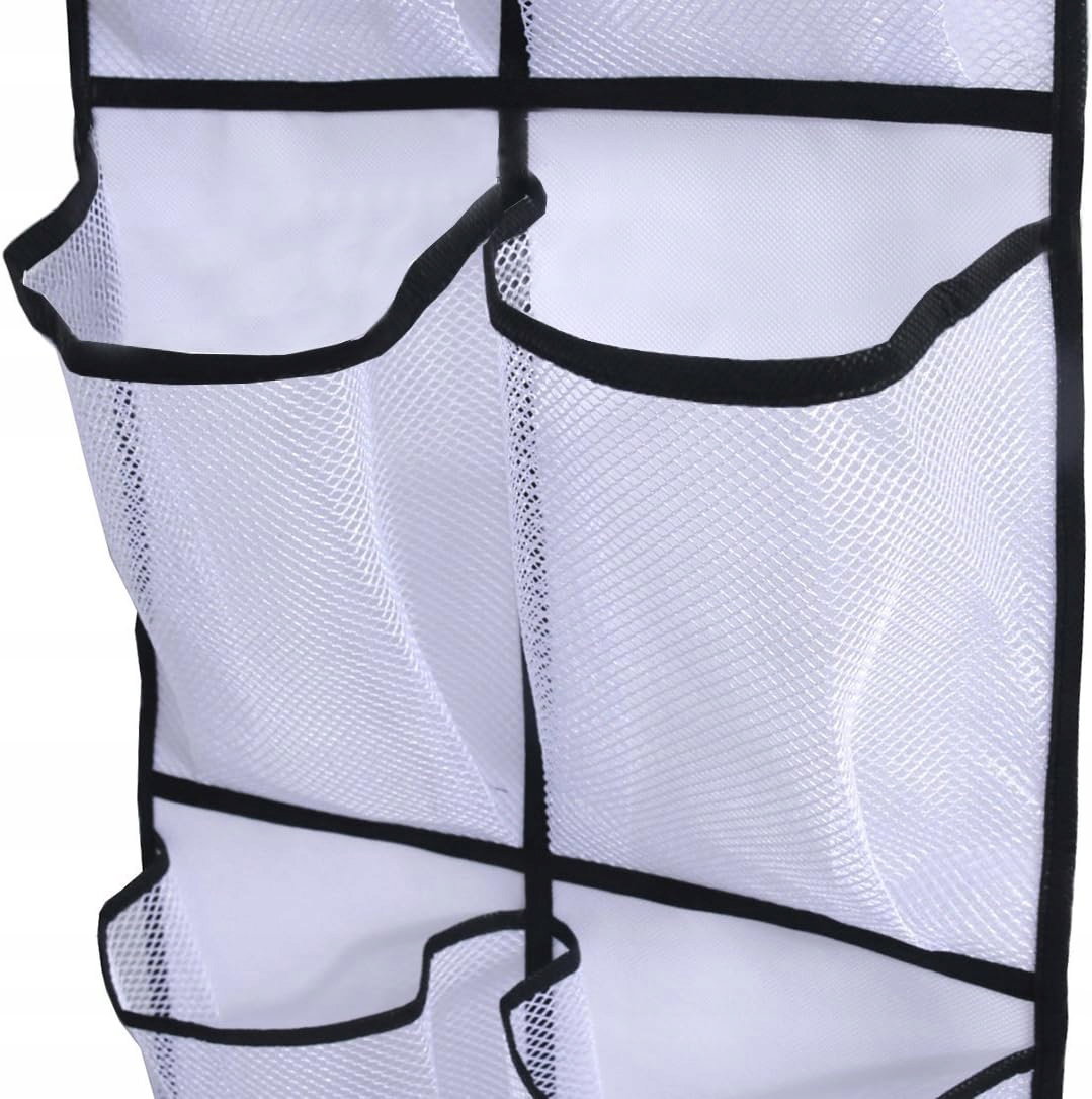 - 12 przestronnych kieszeni: Organizer wyposażony jest w 12 dużych, przezroczystych kieszeni z siatki, które są na tyle szerokie, by pomieścić różnorodne typy obuwia. Można w nim przechowywać buty dziecięce, damskie obuwie do rozmiaru 42/44, a nawet pojedyncze większe buty, takie jak trampki czy szpilki.