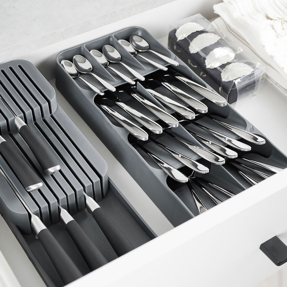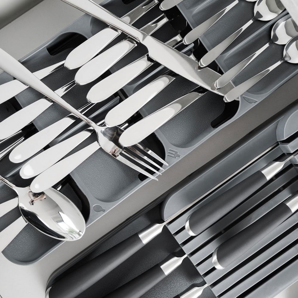 Praktyczny organizer na sztućce. Posiada odpowiednią konstrukcję, wiec zajmuje mało miejsca. Dzięki niemu noże będą odpowiednio przechowywane w szafce a klasyczny design sprawi, że będzie pasował do każdej szuflady.