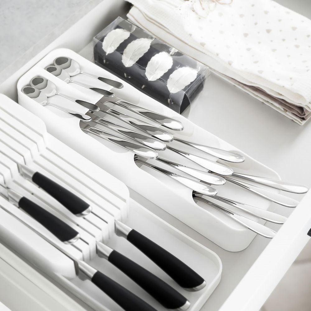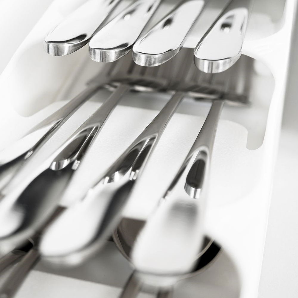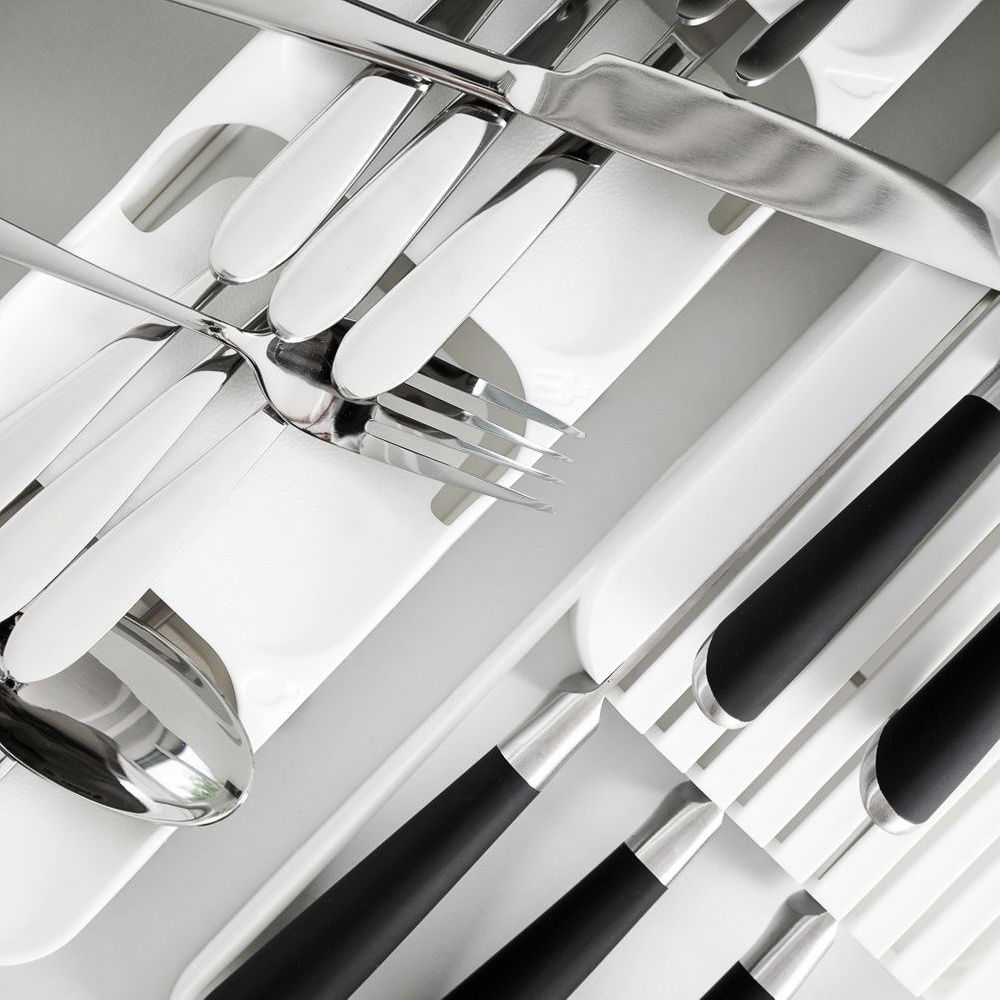 Praktyczny organizer na sztućce. Posiada odpowiednią konstrukcję, wiec zajmuje mało miejsca. Dzięki niemu noże będą odpowiednio przechowywane w szafce a klasyczny design sprawi, że będzie pasował do każdej szuflady.