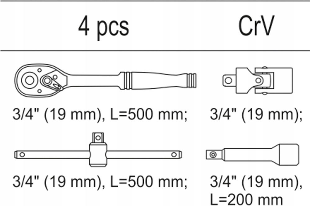 - wkład - grzechotka 3/4" YT-1360 długość 500 mm - przedłużka 3/4" YT-1341 długość 200 mm - przegub 3/4" YT-1352 - pokrętło 3/4" YT-1350 długość 500 mm