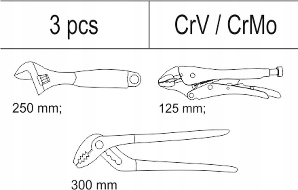 - wkład - klucz nastawny YT-2172 długość 260 mm - szczypce samozaciskowe YT-2449 długość 125 mm - szczypce nastawne YT-2091 długość 300 mm