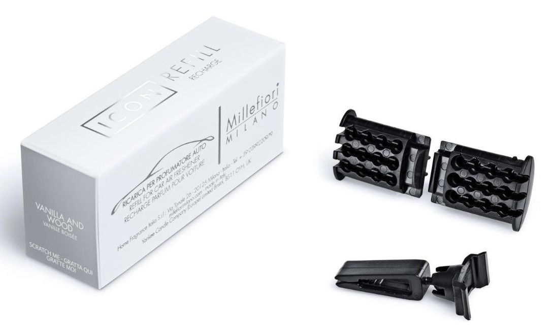 Wkład do odświeżacza samochodowego Millefiori Milano ICON o aromacie VANILLA AND WOOD. Słodki zapach wanilii dopełniony aromatem karmelu i nutami drzewnymi doda wnętrzu pojazdu elegancji i świeżości.