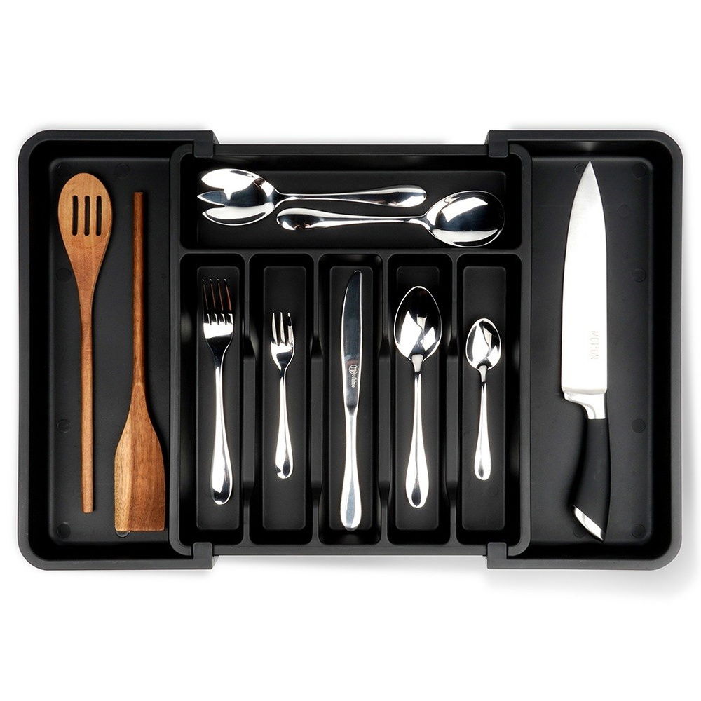 Wkład na sztućce i przybory kuchenne do szuflady - Rozsuwany organizer na sztućce i przybory kuchenne umożliwiający wygodne posegregowanie noży oraz sztućców. Wkład po rozłożeniu ma wymiary 56,5 x 37,5 x 5 cm. Doskonały na sztućce, noże oraz akcesoria kuchenne.