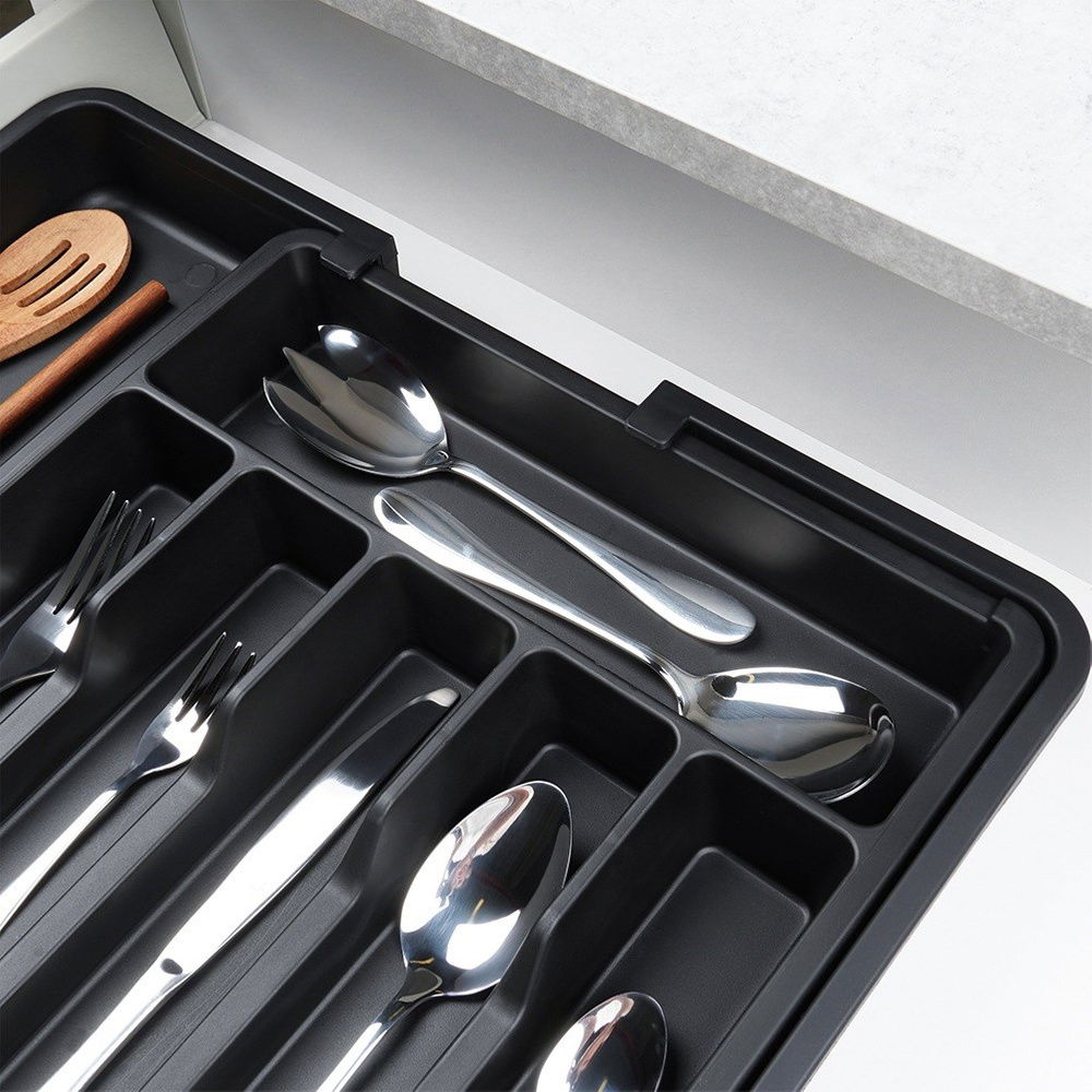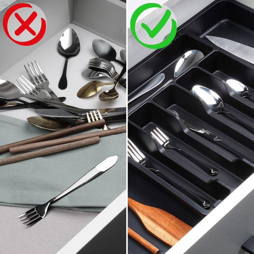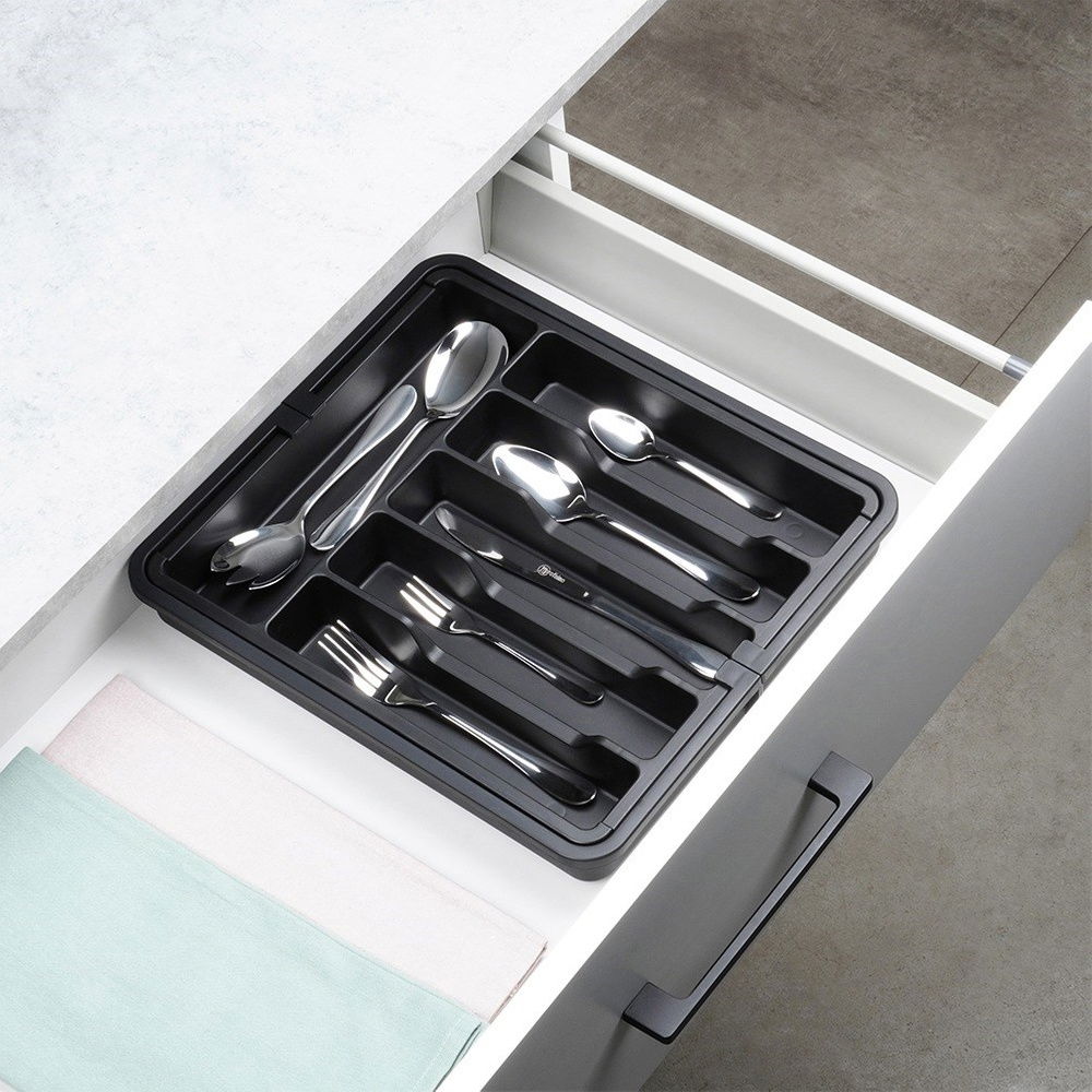 Organizer na sztućce, noże i przybory kuchenne z możliwością rozsuwania. Przydatny w każdej kuchni. Umożliwia przechowywanie różnych akcesoriów kuchennych w sposób uporządkowany i zorganizowany. Taca do szuflady pozwoli odpowiednio zagospodarować przestrzeń oraz utrzymać porządek wewnątrz szuflady. Łatwy w czyszczeniu i wygodny w użytkowaniu.