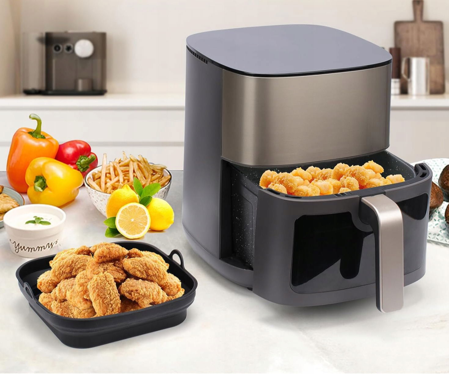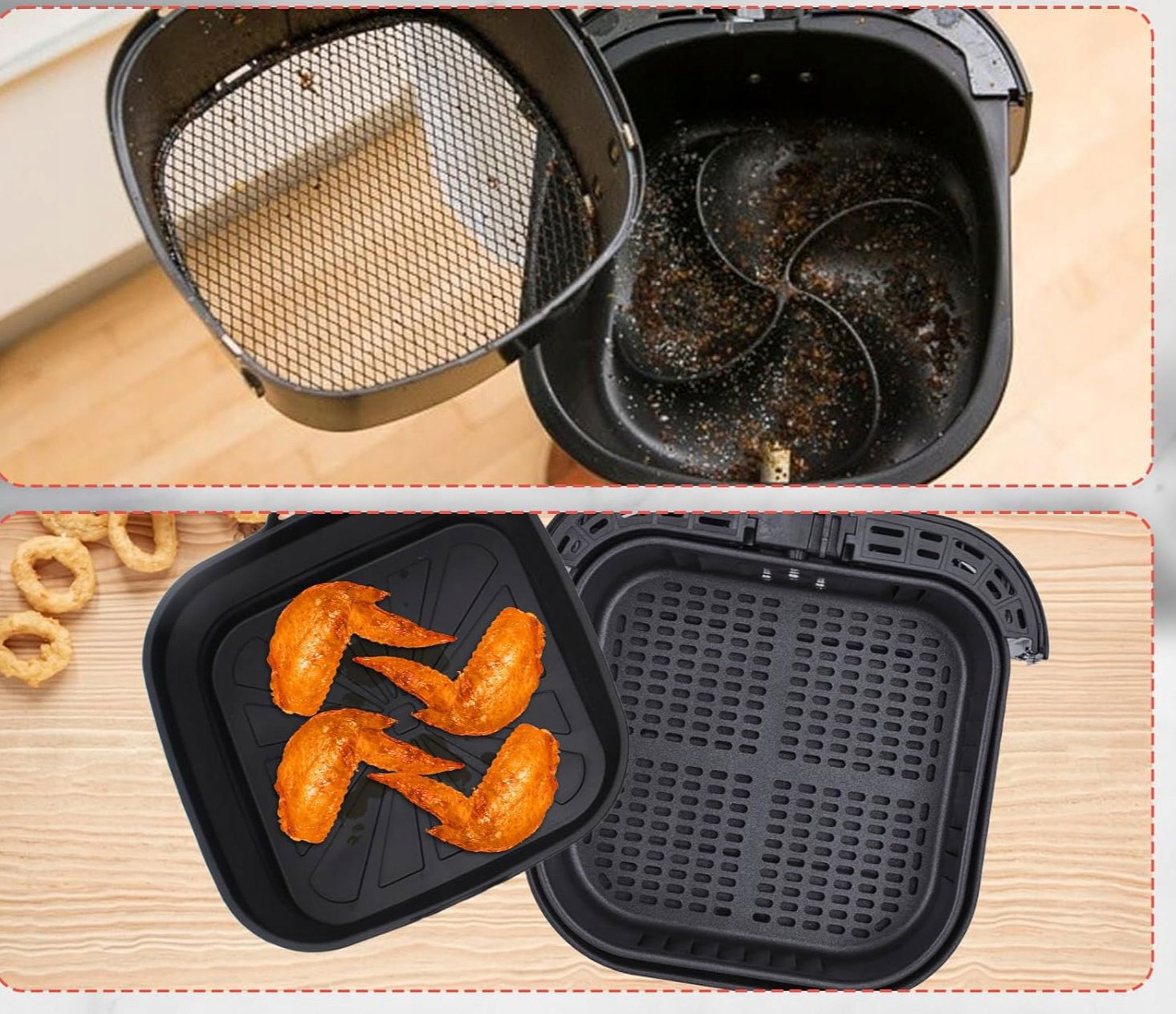 ✅ CECHY DODATKOWE: Składana, wielokrotnego użytku, wykonana z silikonu spożywczego, łatwa w czyszczeniu, odporna na wysokie temperatury, poprawia cyrkulację powietrza, odprowadza tłuszcz.